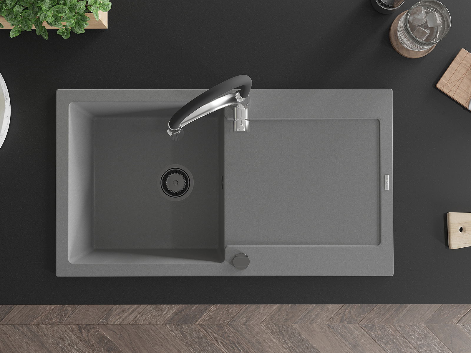 Mexen Leo chiuvetă de bucătărie din granit cu 1 cuvă și scurgător, robinet de bucătărie Aster, gri - 6501-71-73450-07-B