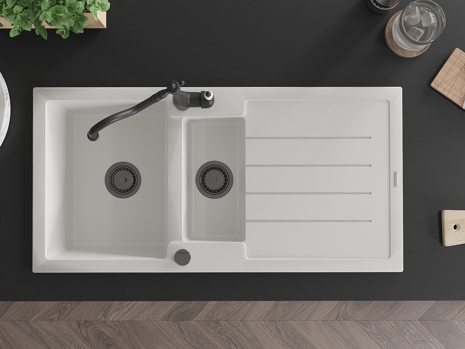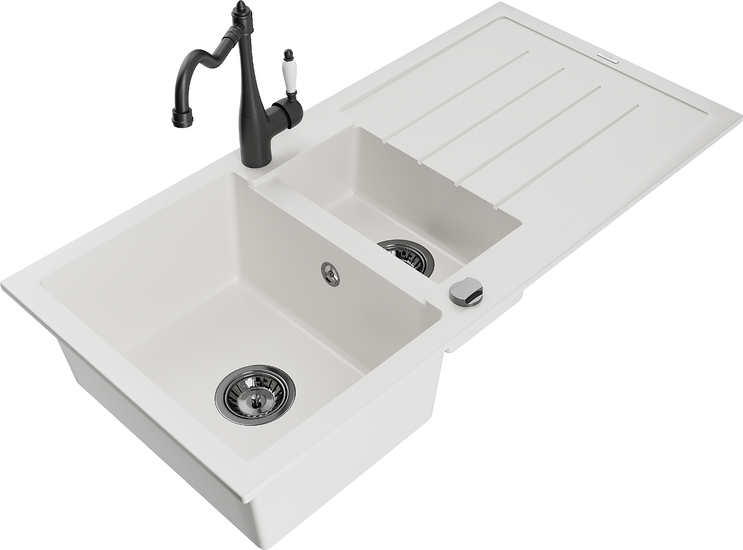 Mexen Andres chiuvetă din granit cu 1,5 compartimente și scurgător și baterie de bucătărie Carla, alb - 6515-20-670700-70