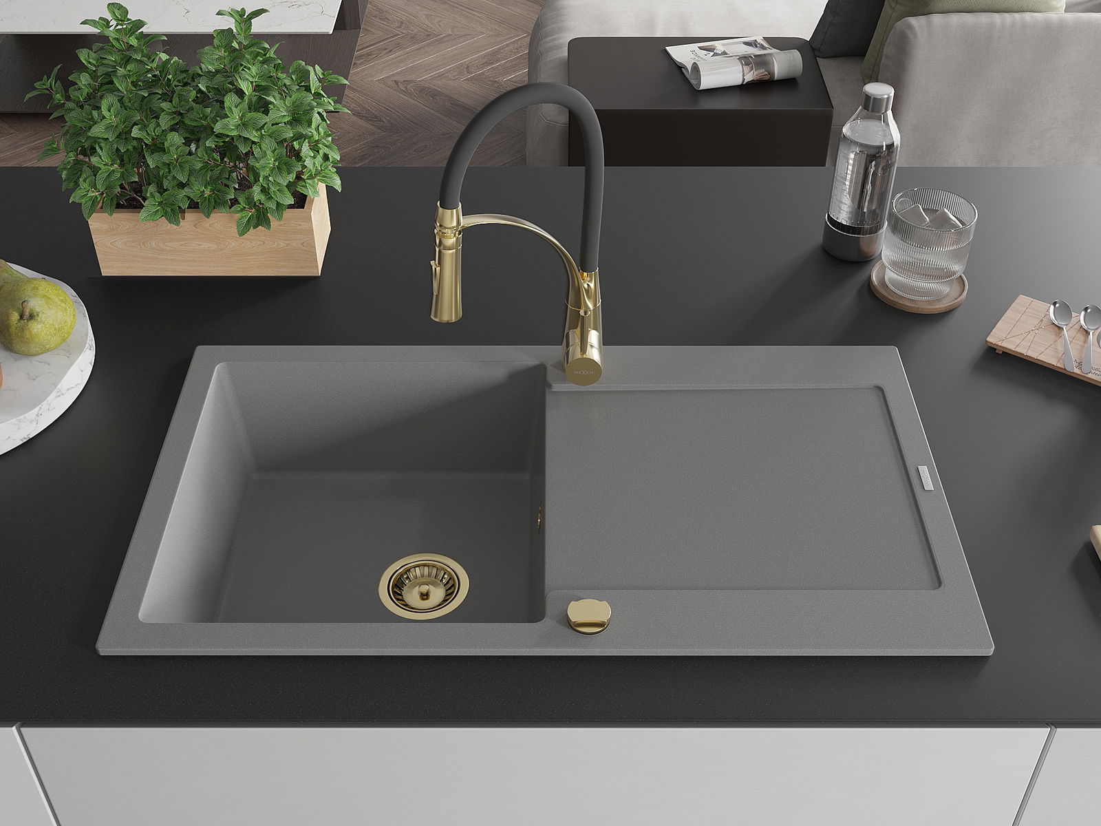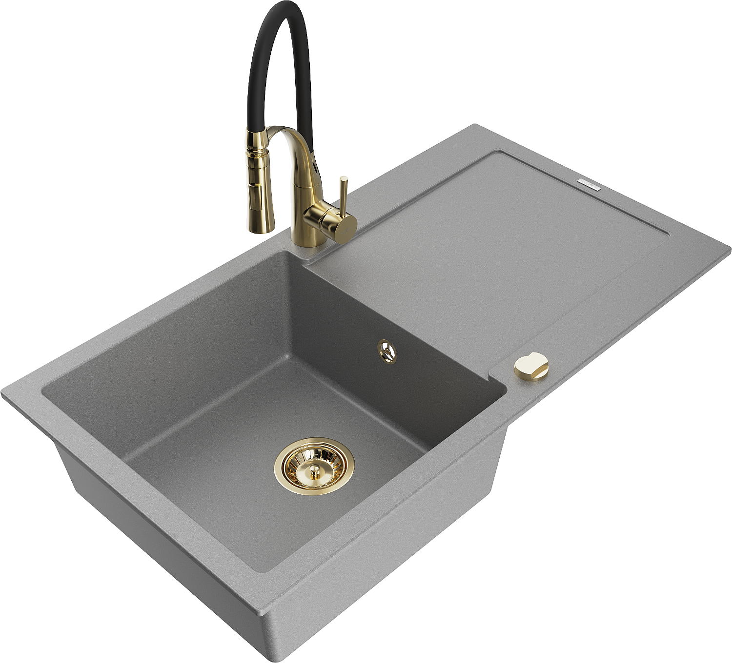 Mexen Leo chiuvetă de granit cu 1 compartiment cu scurgător și baterie de bucătărie Aster, gri - 6501-71-73450-57-G