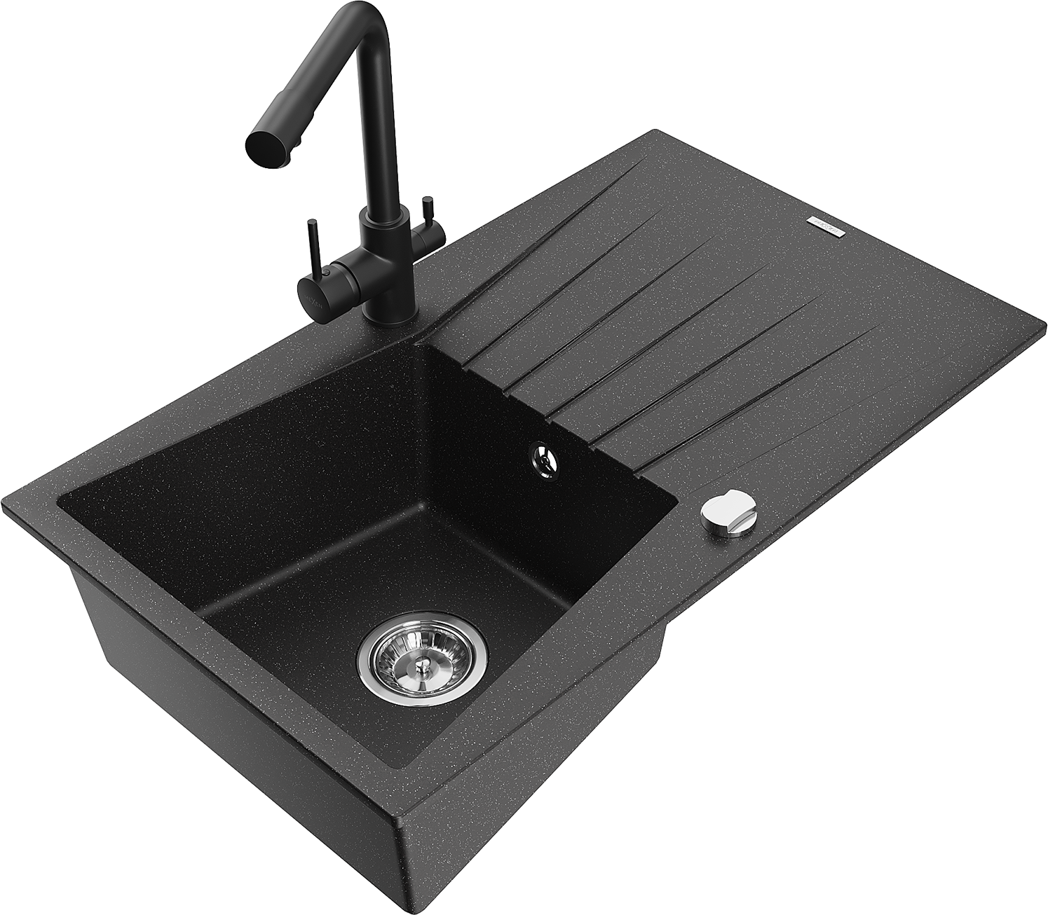 Mexen Cesar chiuvetă pentru bucătărie din granit cu 1 cuvă, cu scurgător și baterie Duero, negru/argintiu metalizat