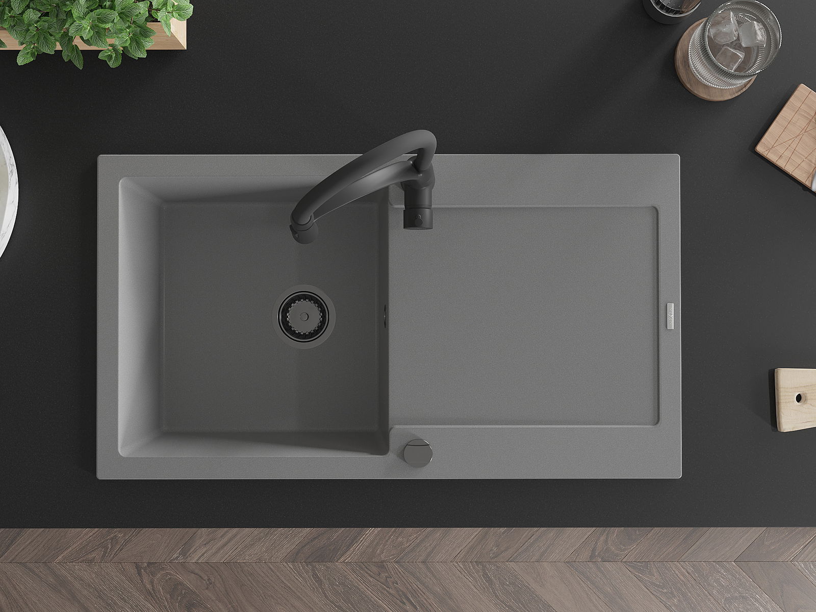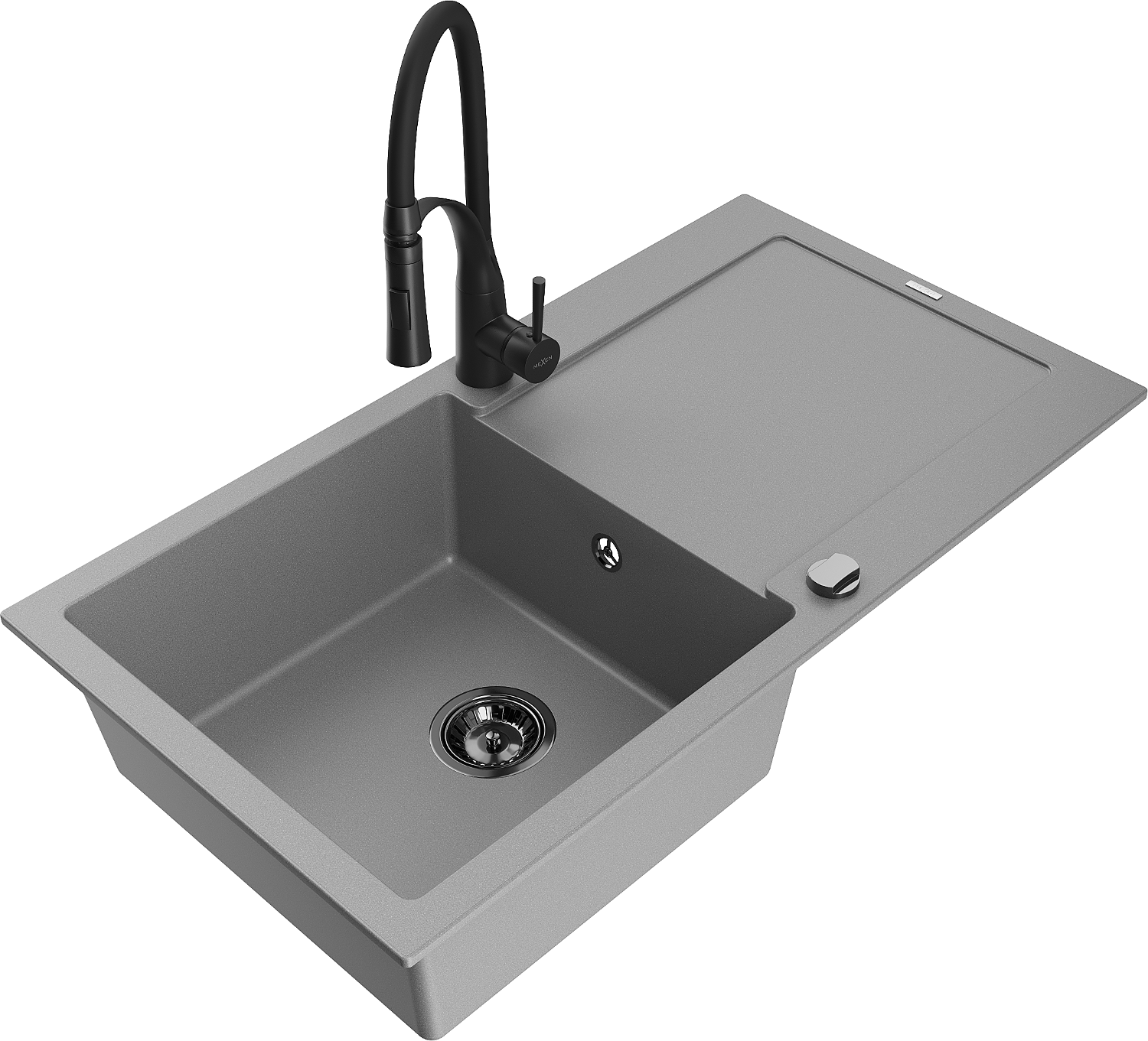 Mexen Leo chiuvetă de granit cu 1 cameră cu scurgător și baterie de bucătărie Aster, gri - 6501-71-73450-70-B