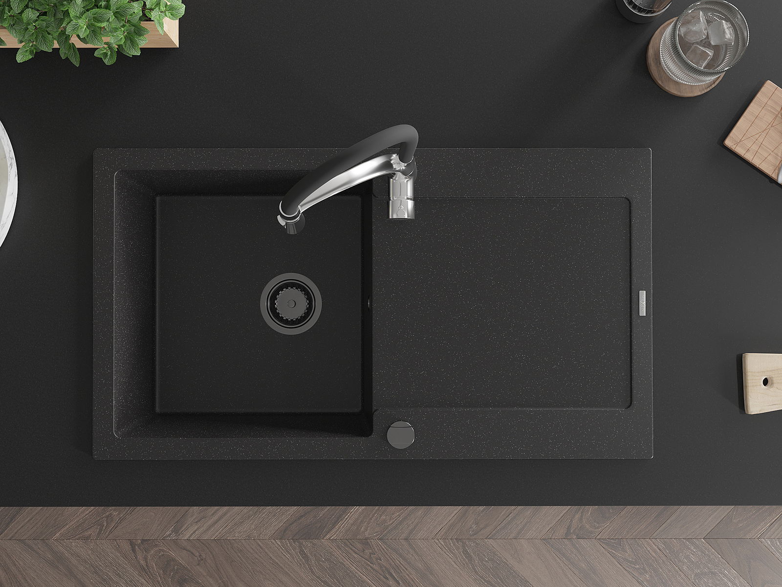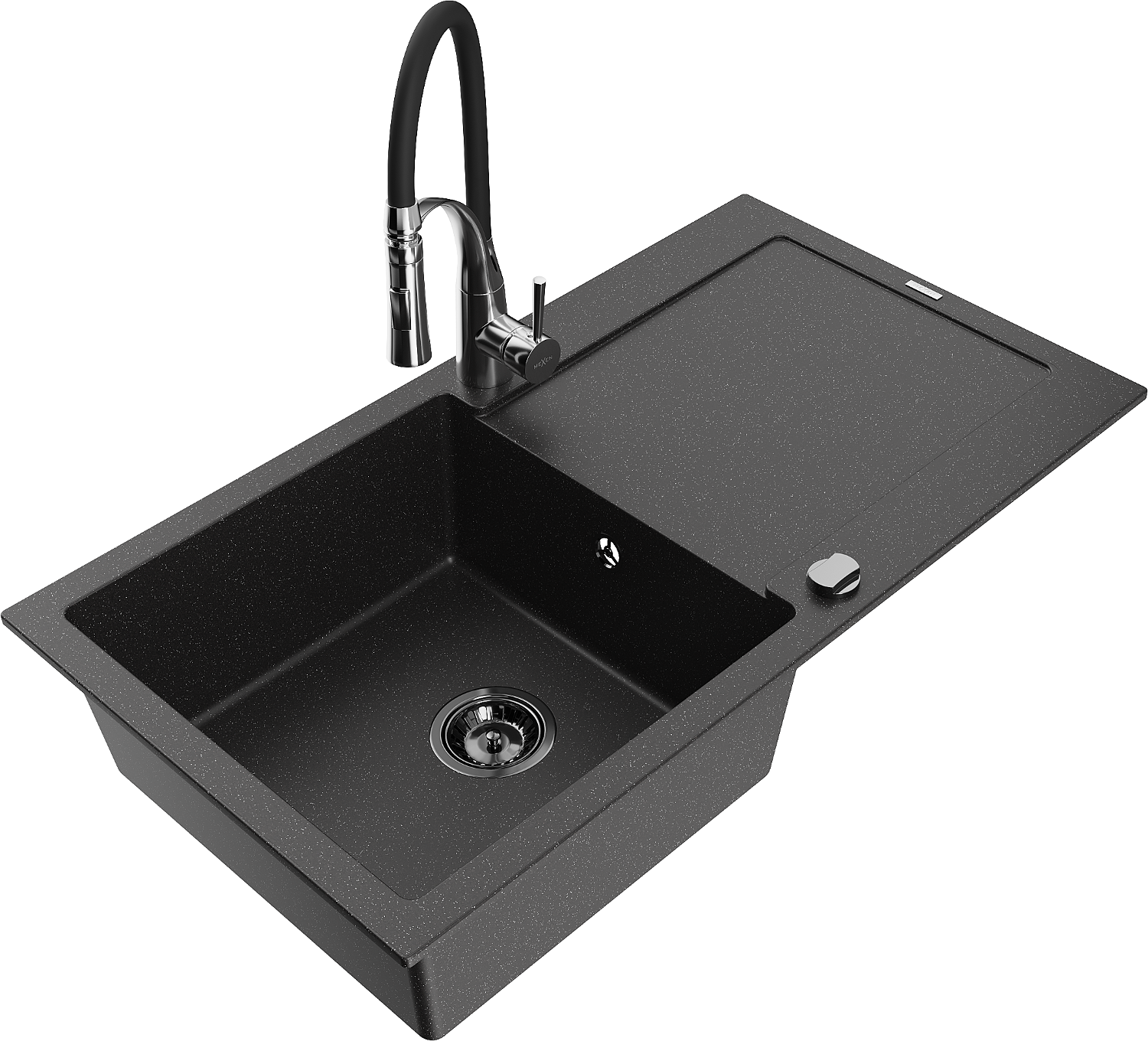 Mexen Leo chiuvetă de bucătărie din granit cu o singură cuvă cu picurător și baterie Aster, negru/argintiu metalizat