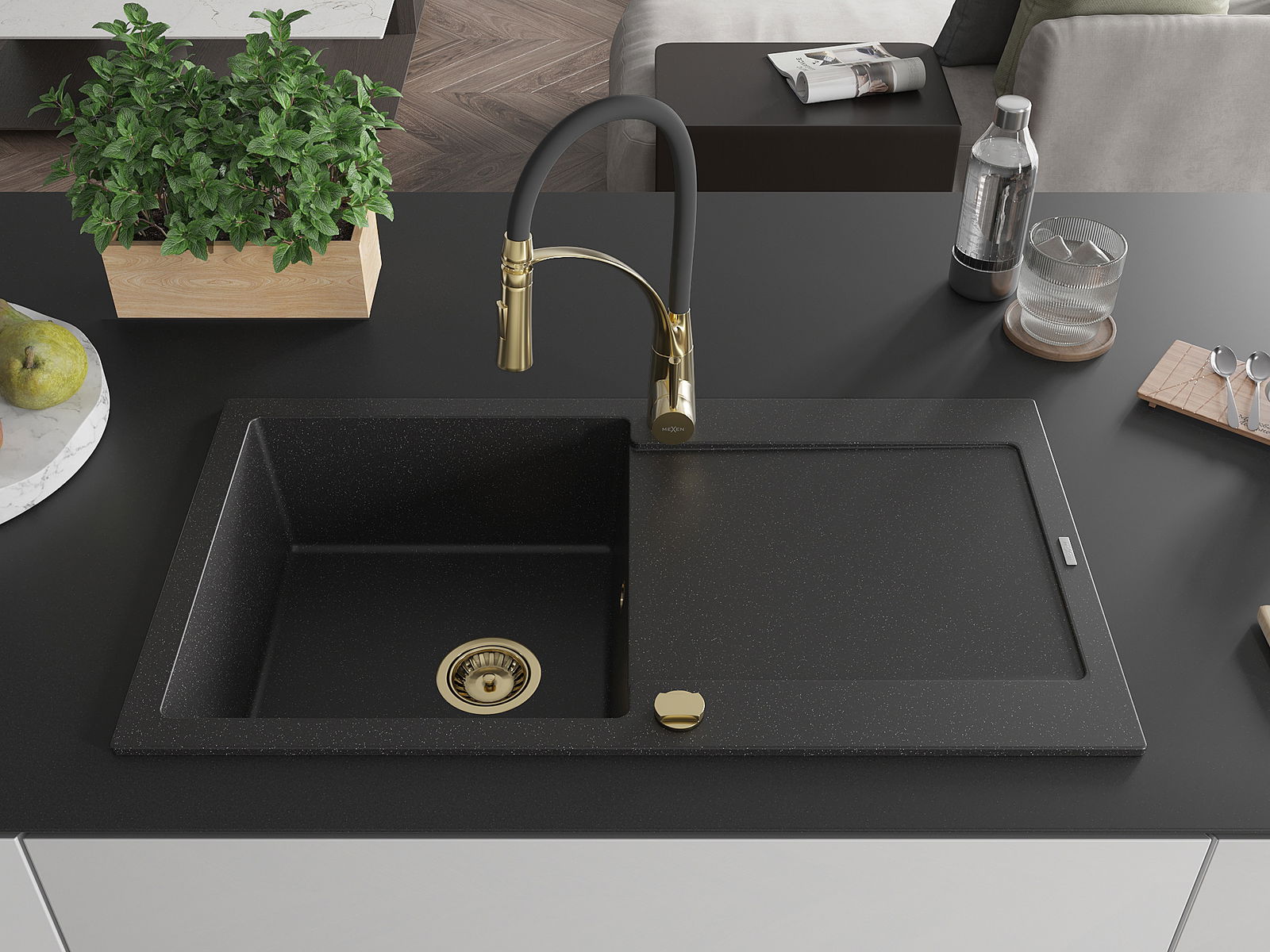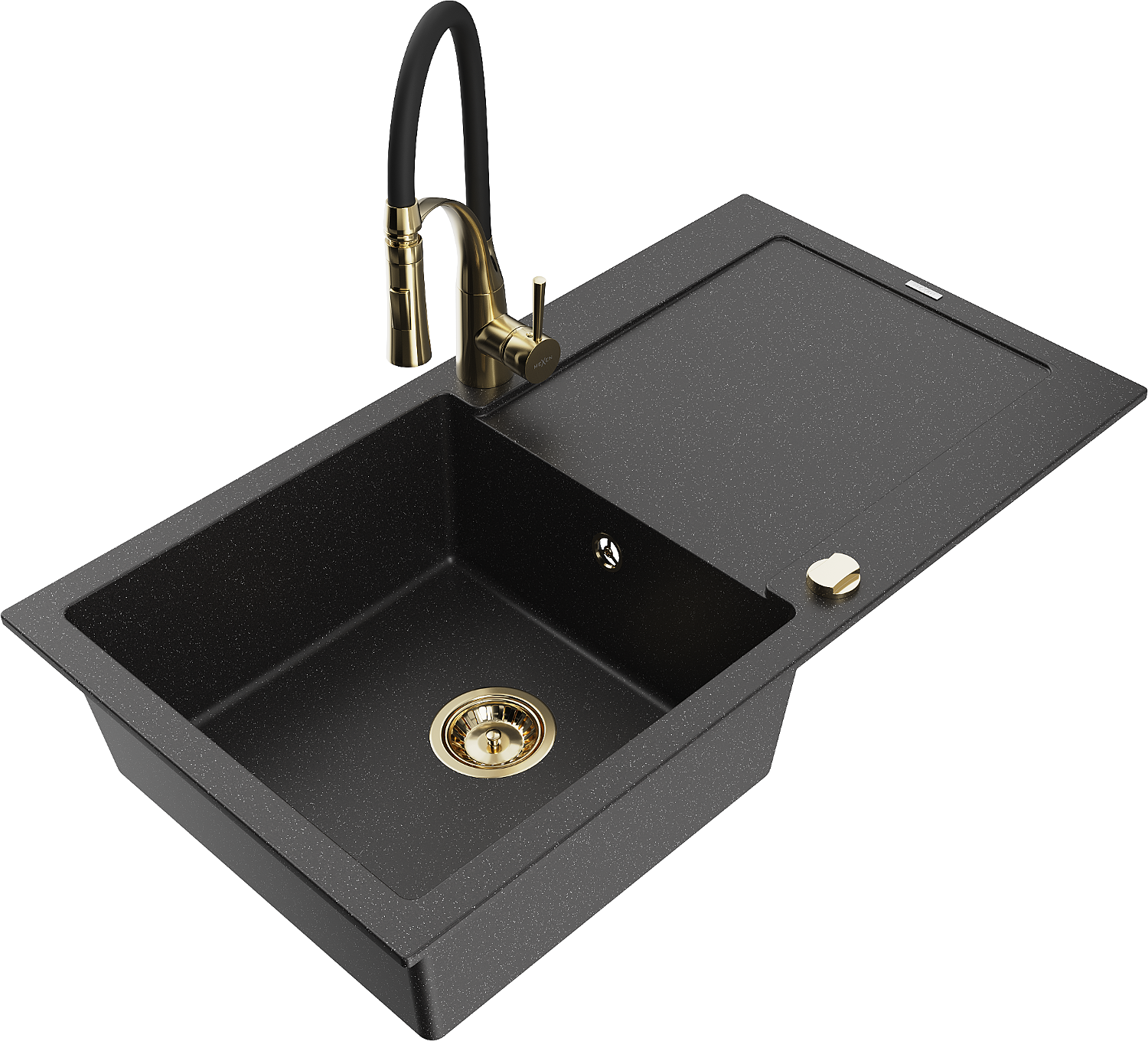 Mexen Leo chiuvetă de bucătărie din granit cu 1 compartiment, cu scurgător și baterie Aster, negru/argintiu metalic