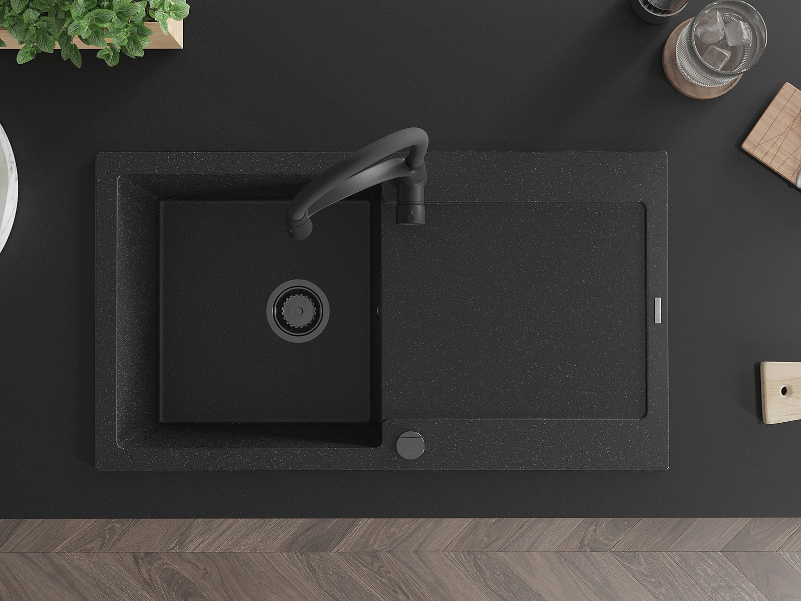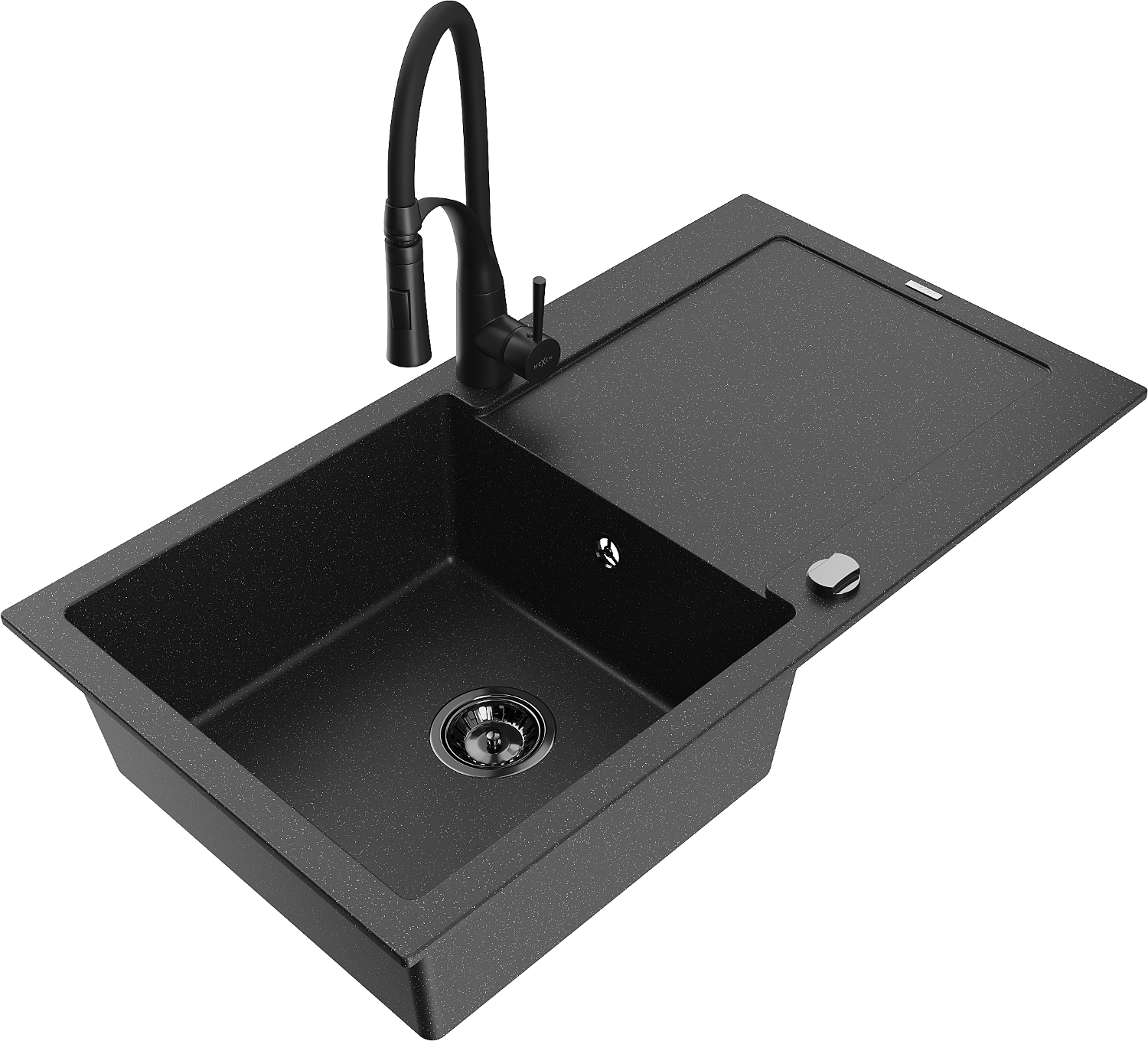 Mexen Leo chiuvetă de granit cu 1 compartiment cu scurgător și baterie de bucătărie Aster, negru/argintiu metalic