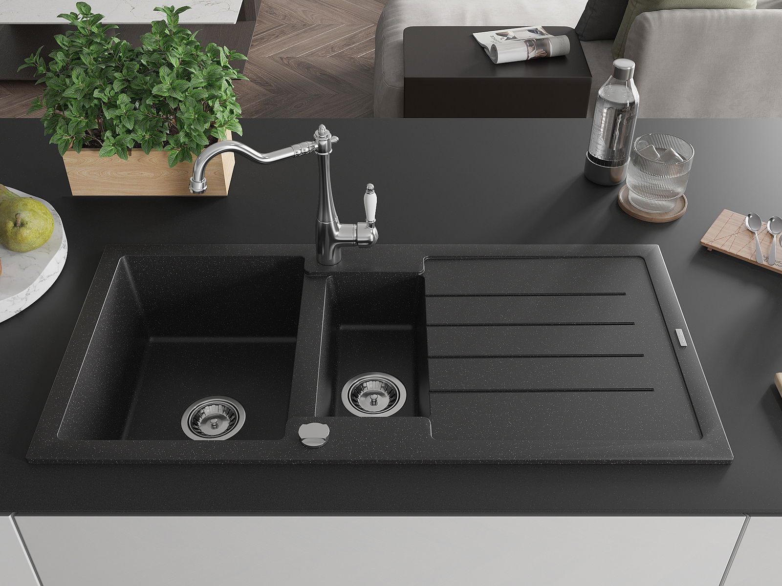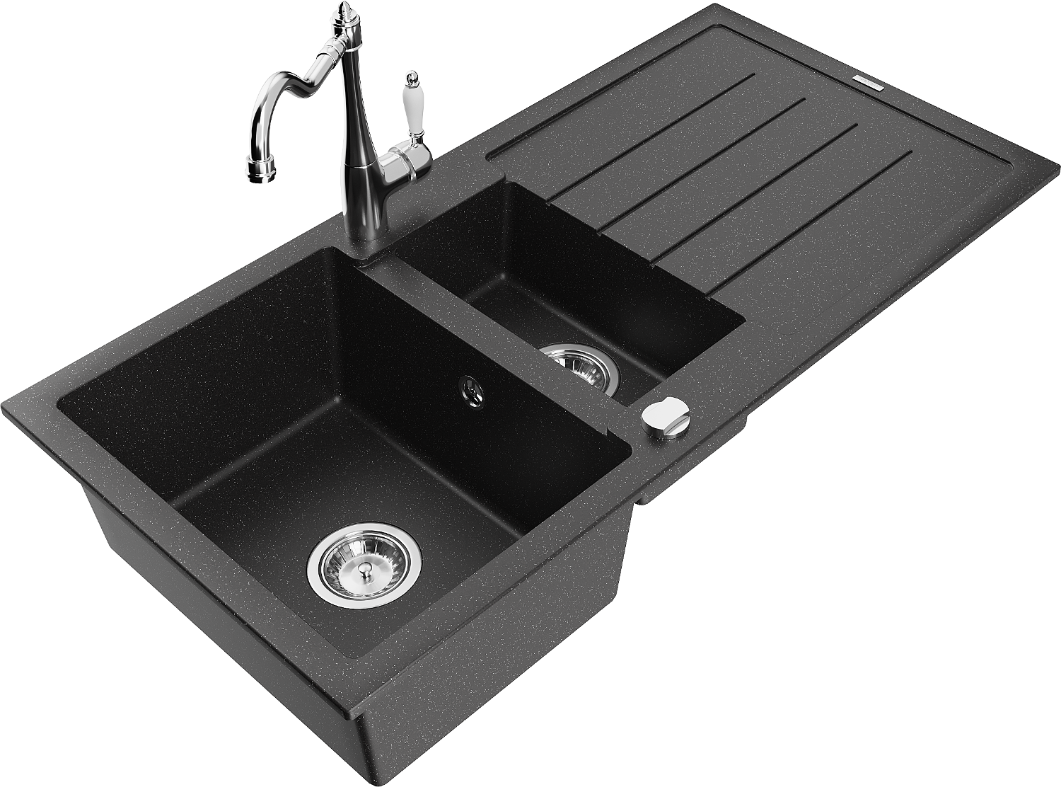 Mexen Andres chiuvetă de granit cu 1,5 cuve cu picurător și baterie de bucătărie Carla, negru/argintiu - 6515-73-670700-00