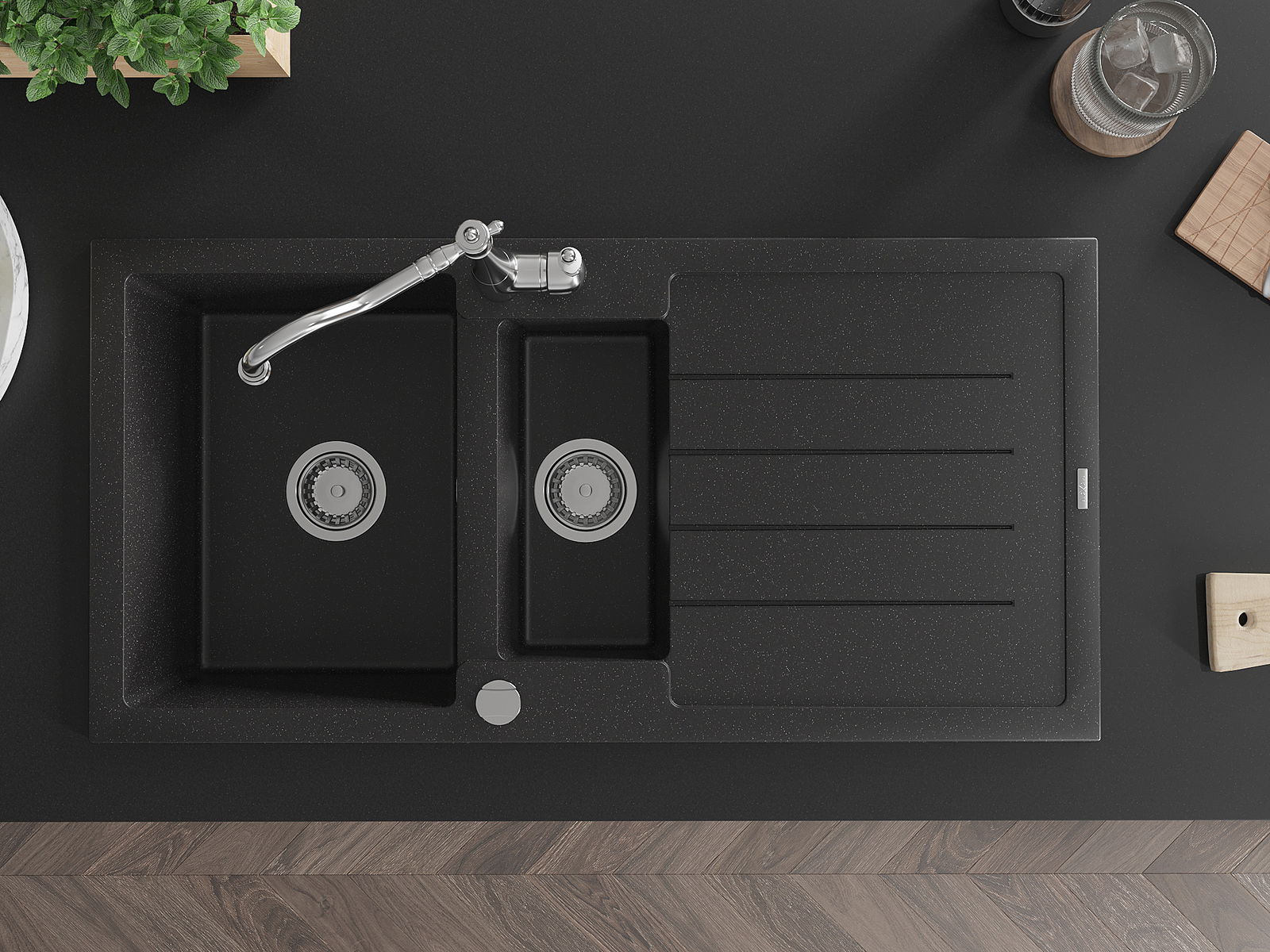 Datorită sistemului de montare universală, chiuveta este reversibilă, iar scurgerea poate fi montată pe blat la stânga sau la dreapta. În acest fel, puteți ajusta cu ușurință pagina la nevoile și condițiile dvs.