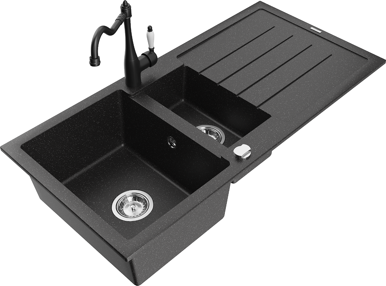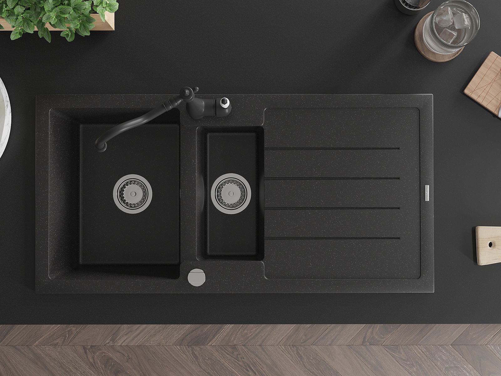 Mexen Andres chiuvetă de granit cu 1,5 cuve, cu scurgător și baterie de bucătărie Carla, negru/argintiu - 6515-73-670700-70