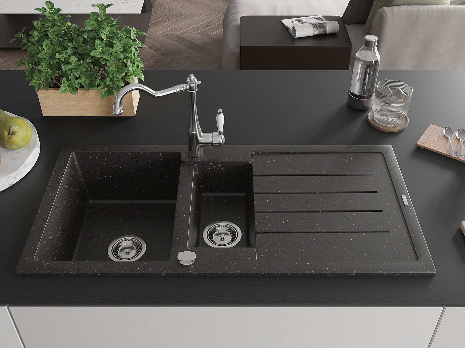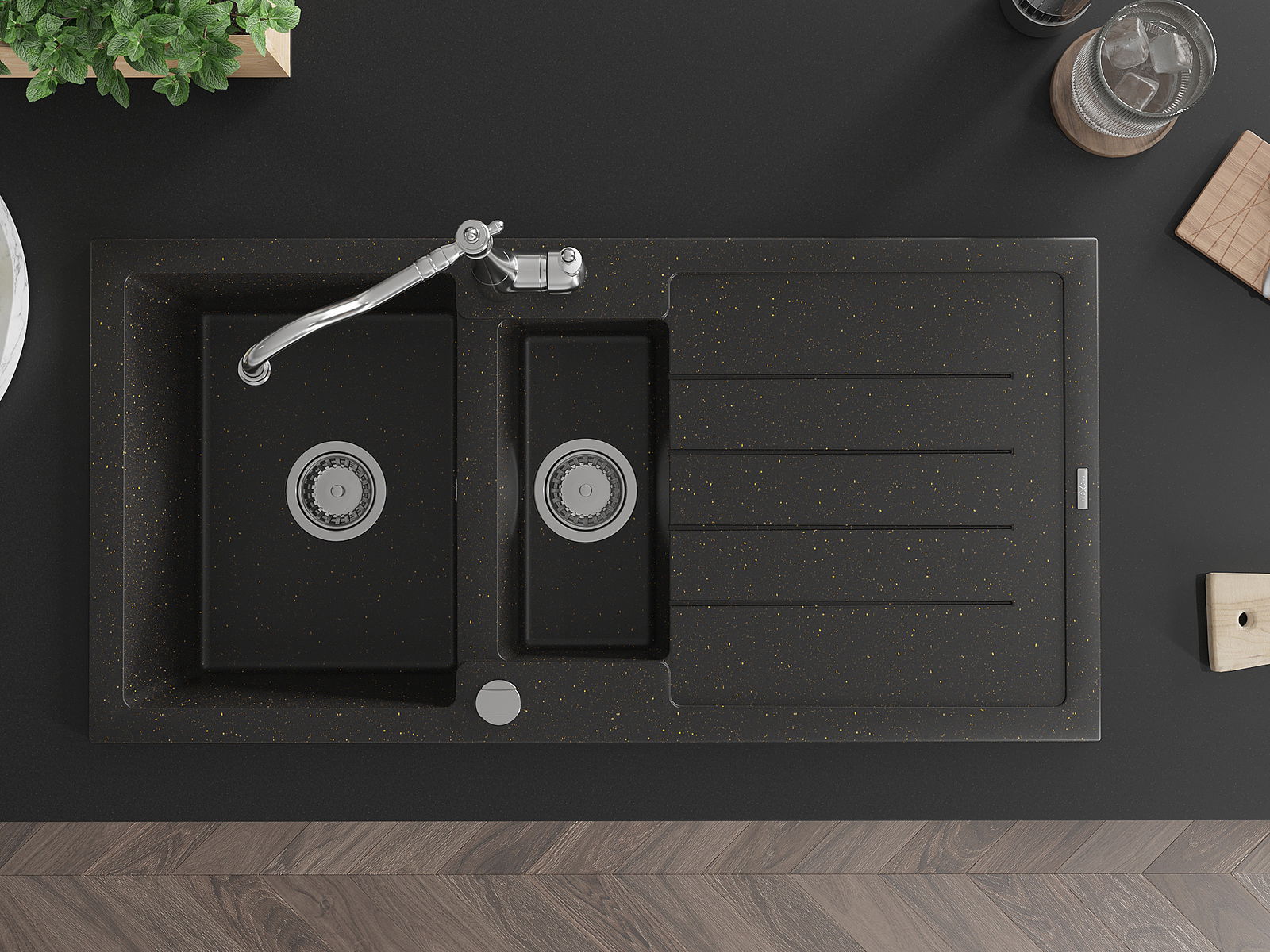 Mexen Andres chiuvetă de bucătărie din granit cu 1,5 cuve și scurgător, cu baterie de bucătărie Carla, negru/auriu
