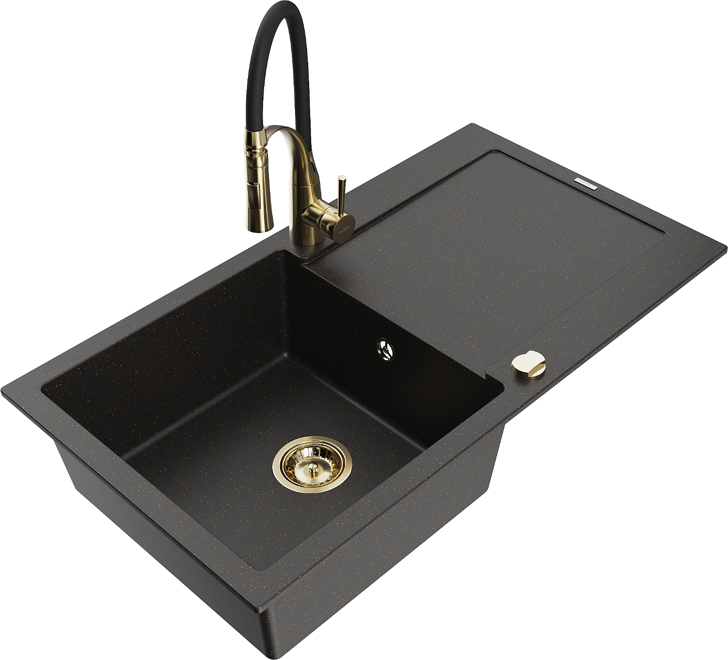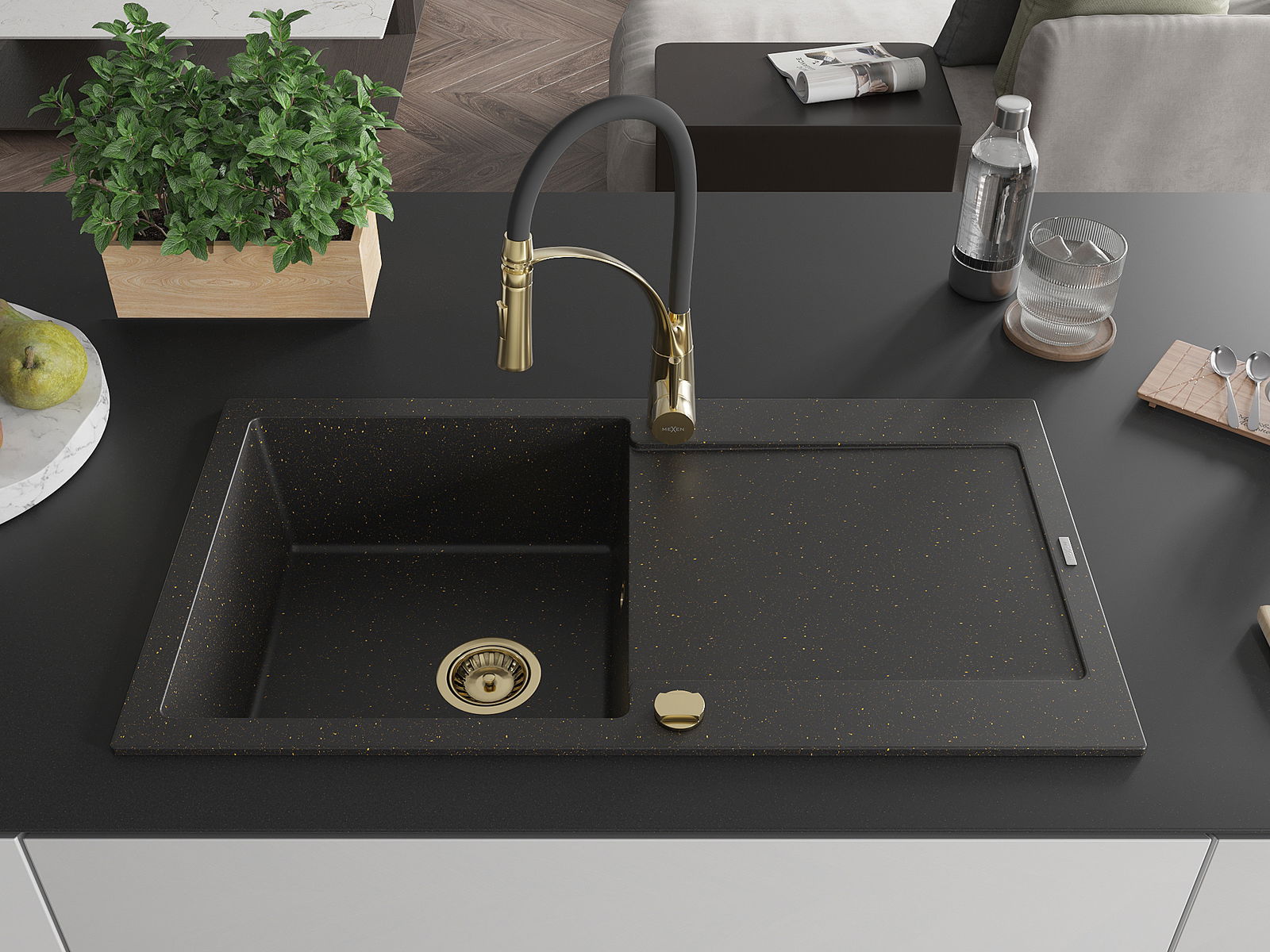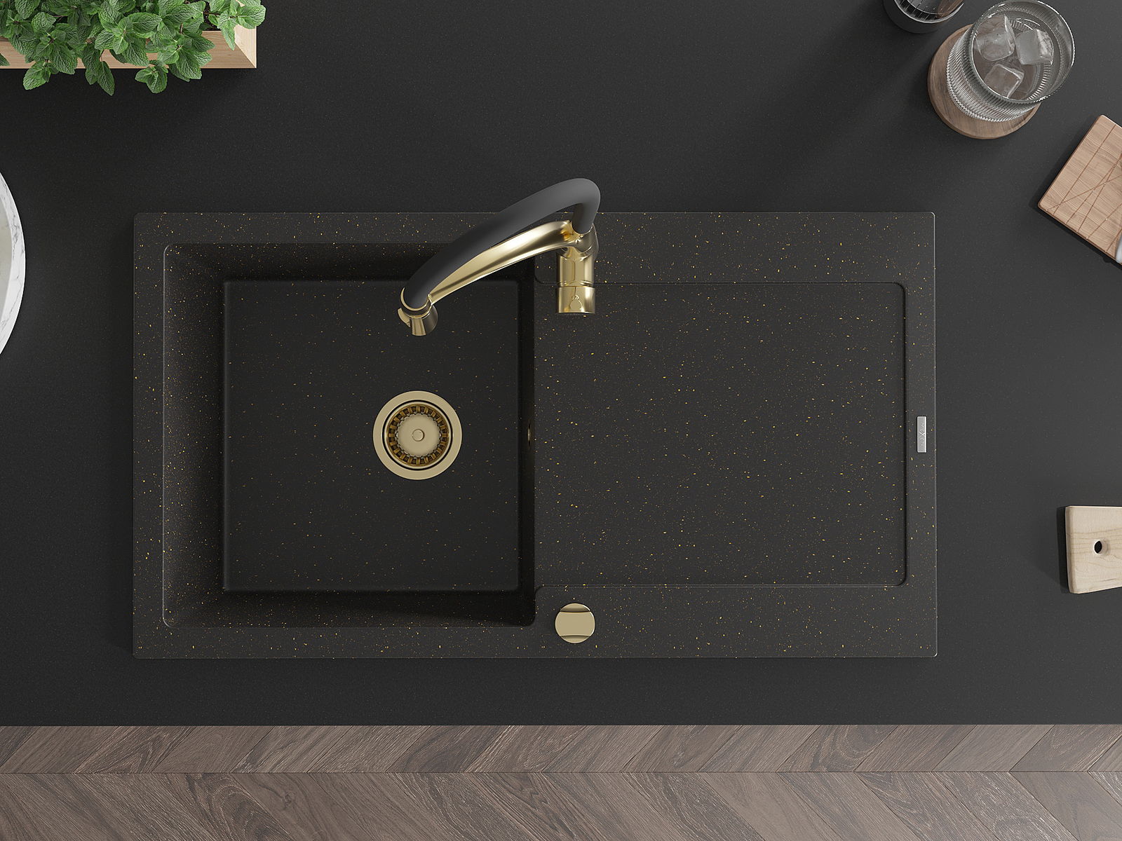 Mexen Leo chiuvetă de granit cu 1 compartiment, cu scurgător și cu baterie de bucătărie Aster, negru/auriu metalic