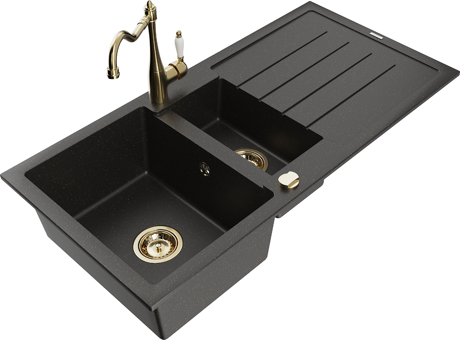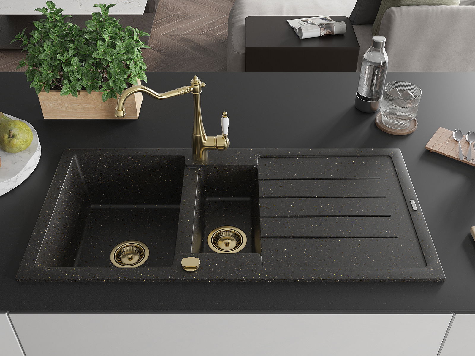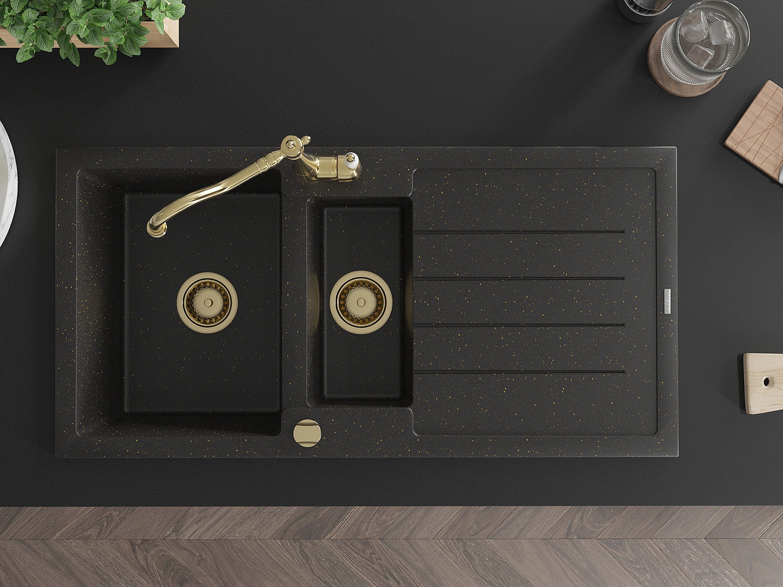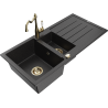 Mexen Andres chiuvetă de granit cu 1,5 compartimente, cu drenaj și baterie de bucătărie Carla, negru/auriu metalizat