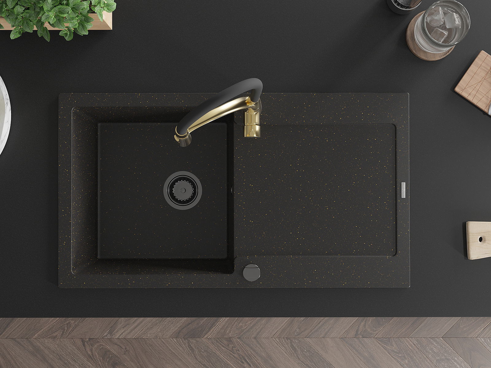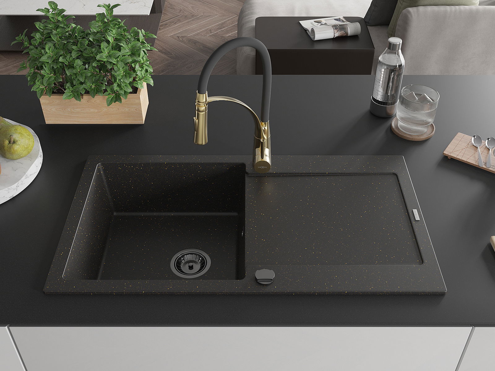 Mexen Leo chiuvetă de granit cu 1 compartiment, cu scurgător și baterie de bucătărie Aster, negru/auriu metalic