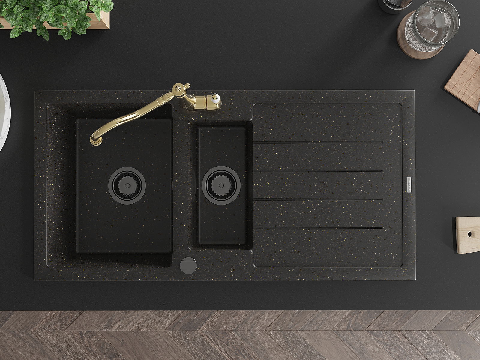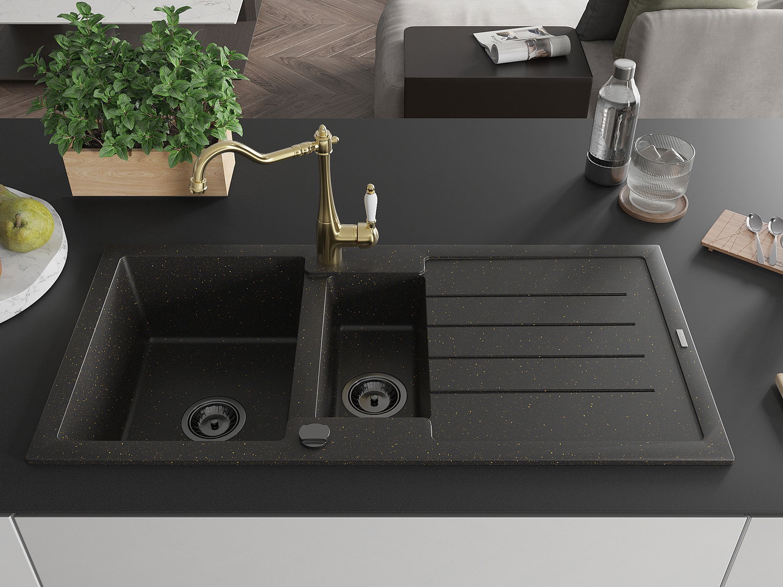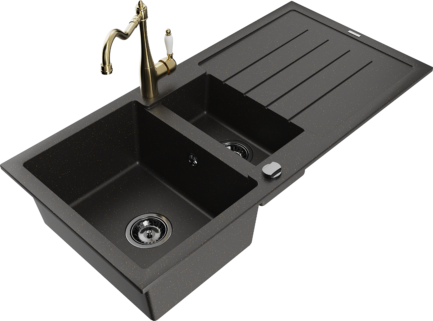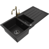 Mexen Andres chiuvetă de granit cu 1,5 cuve, cu scurgător și baterie de bucătărie Carla, negru/auriu - 6515-75-670700-50-B