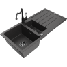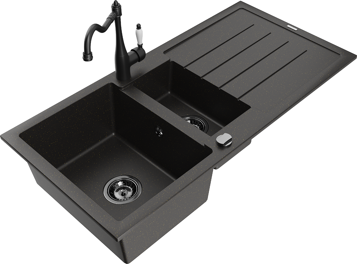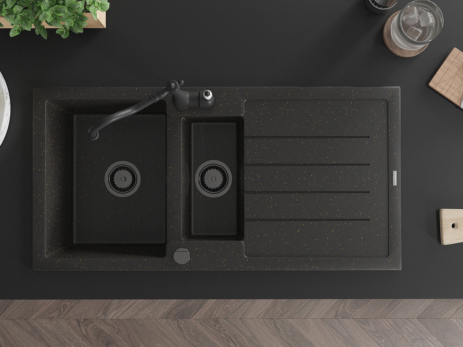 Mexen Andres chiuvetă din granit cu 1,5 compartimente, cu scurgător și baterie de bucătărie Carla, negru/auriu