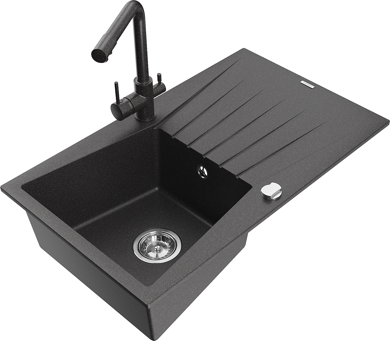 Mexen Cesar chiuvetă din granit cu 1 cuvă cu scurgător și baterie de bucătărie Duero, negru pătat - 6514-76-671600-76
