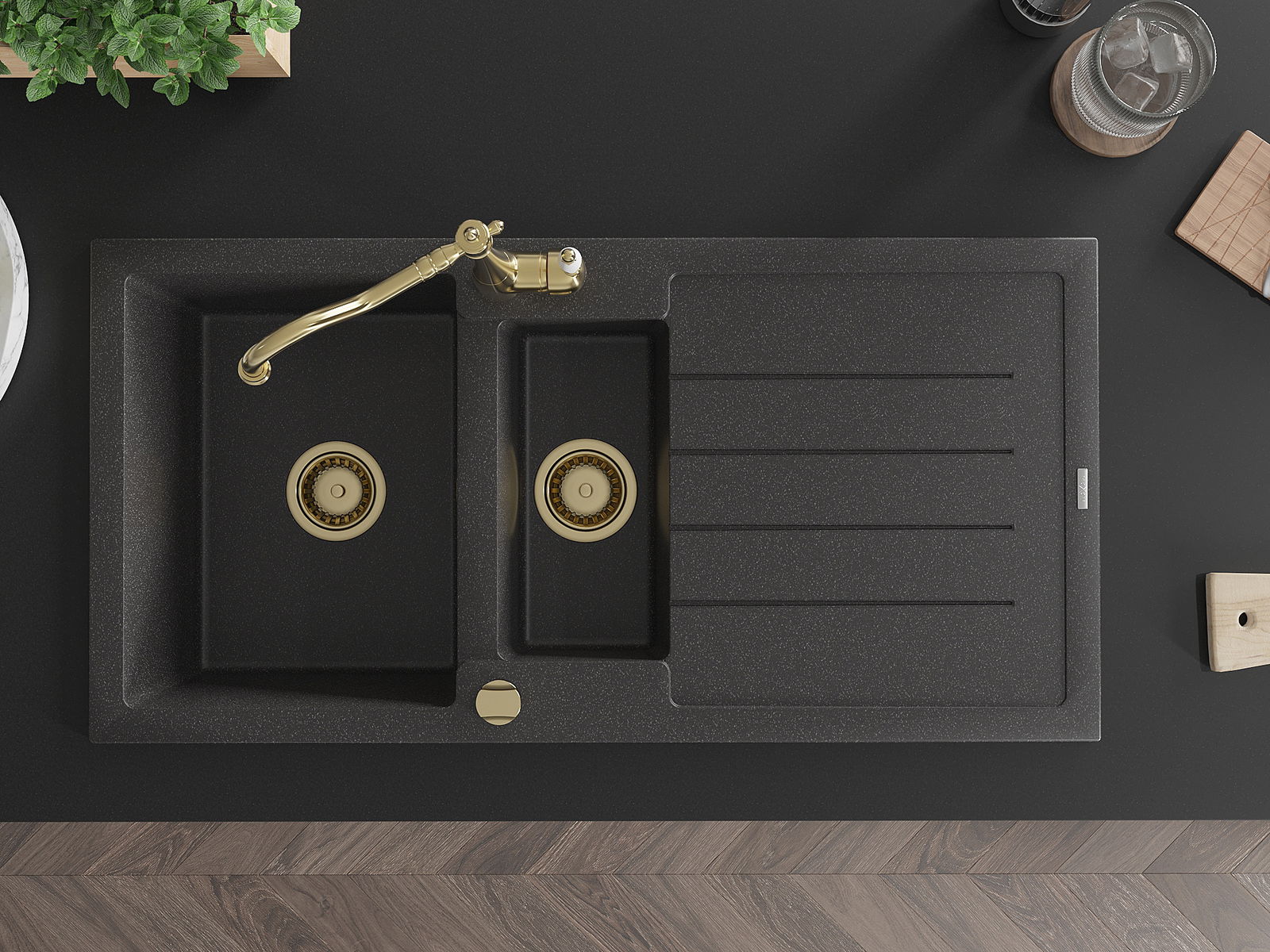 Mexen Andres chiuvetă granit 1,5-camere cu scurgător și baterie de bucătărie Carla, negru pătat - 6515-76-670700-50