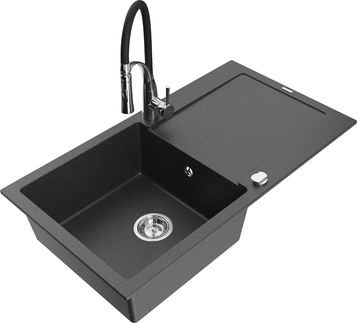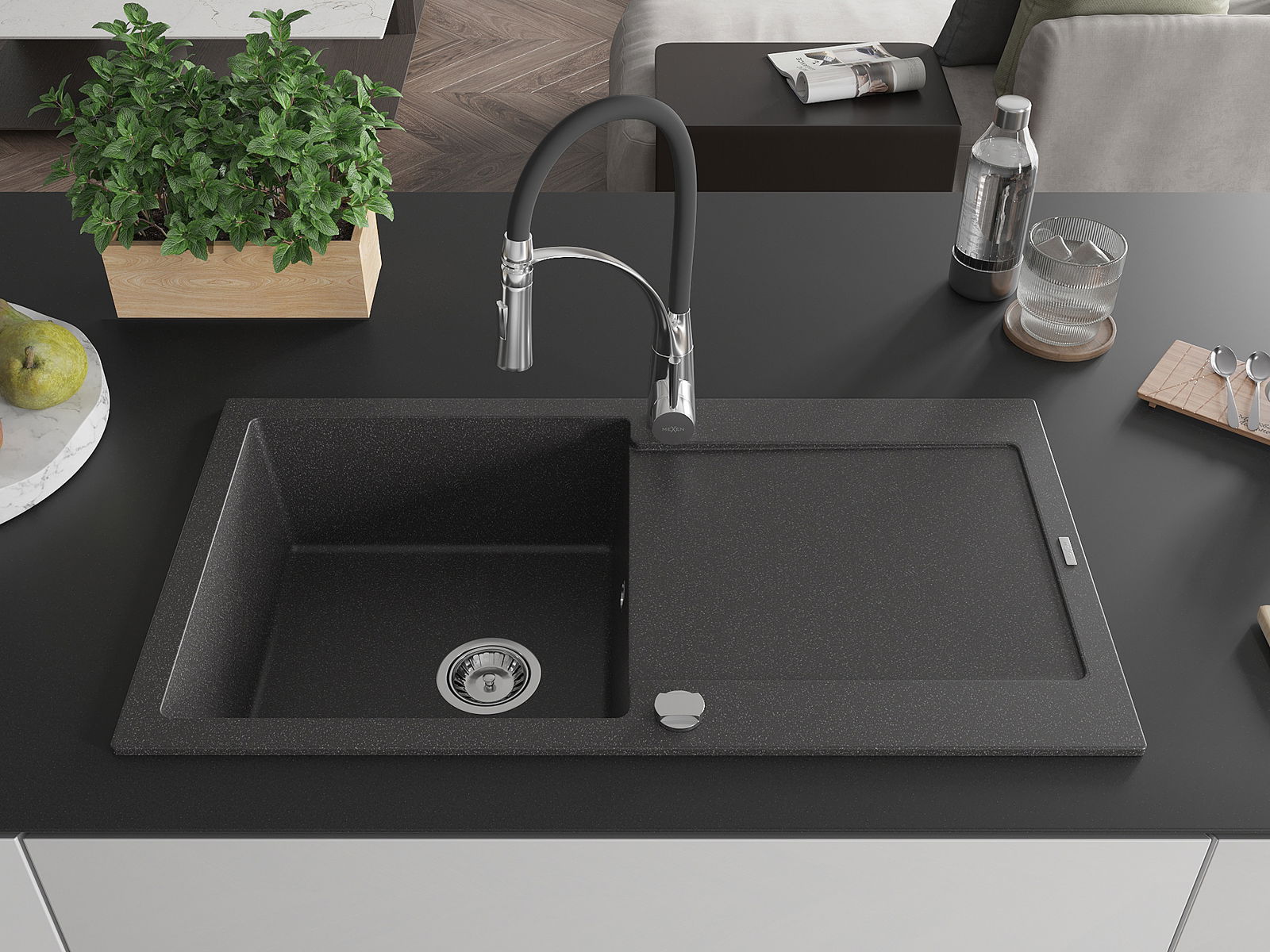 Mexen Leo chiuvetă de bucătărie din granit cu o singură cuvă, cu scurgător și robinet Aster, negru stropit