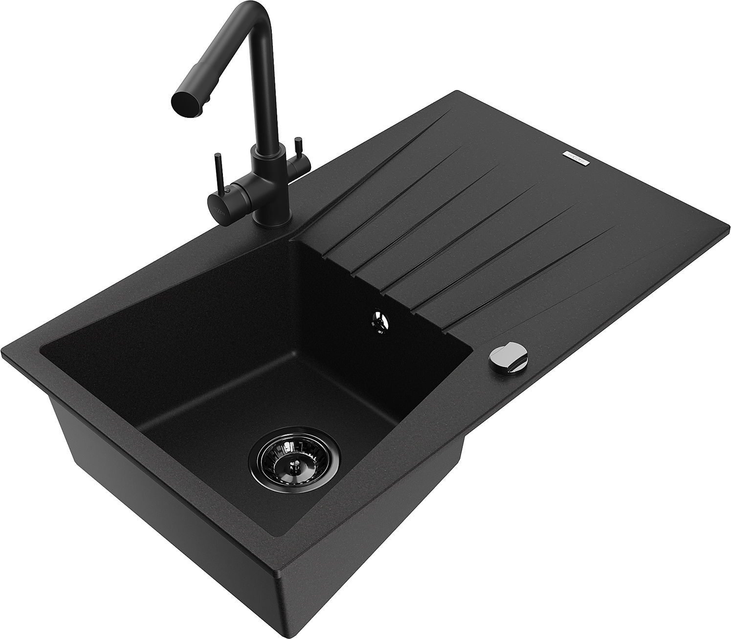 Mexen Cesar chiuvetă de granit cu 1 compartiment, cu scurgător și baterie de bucătărie Duero, neagră - 6514-77-671600-70-B