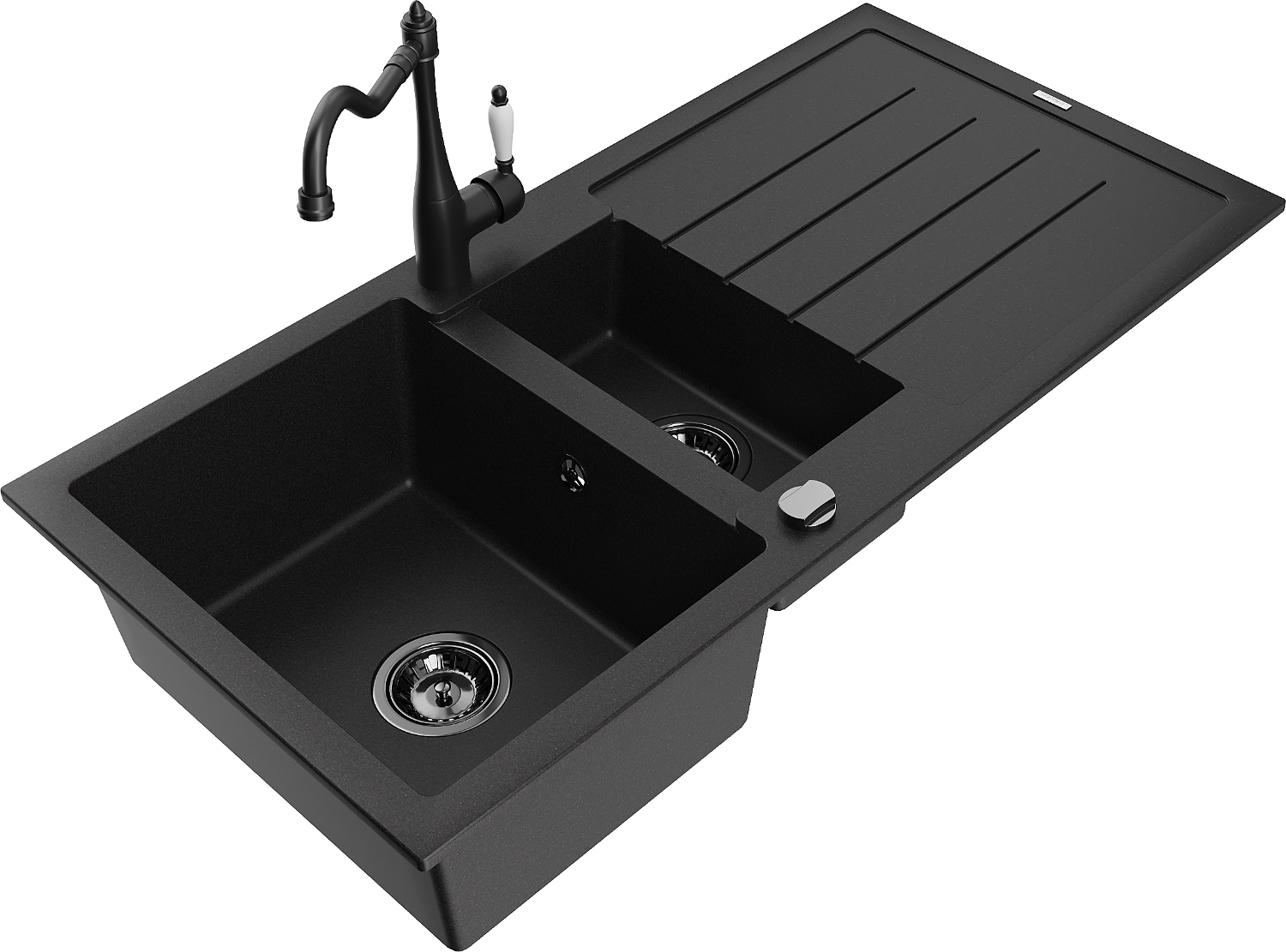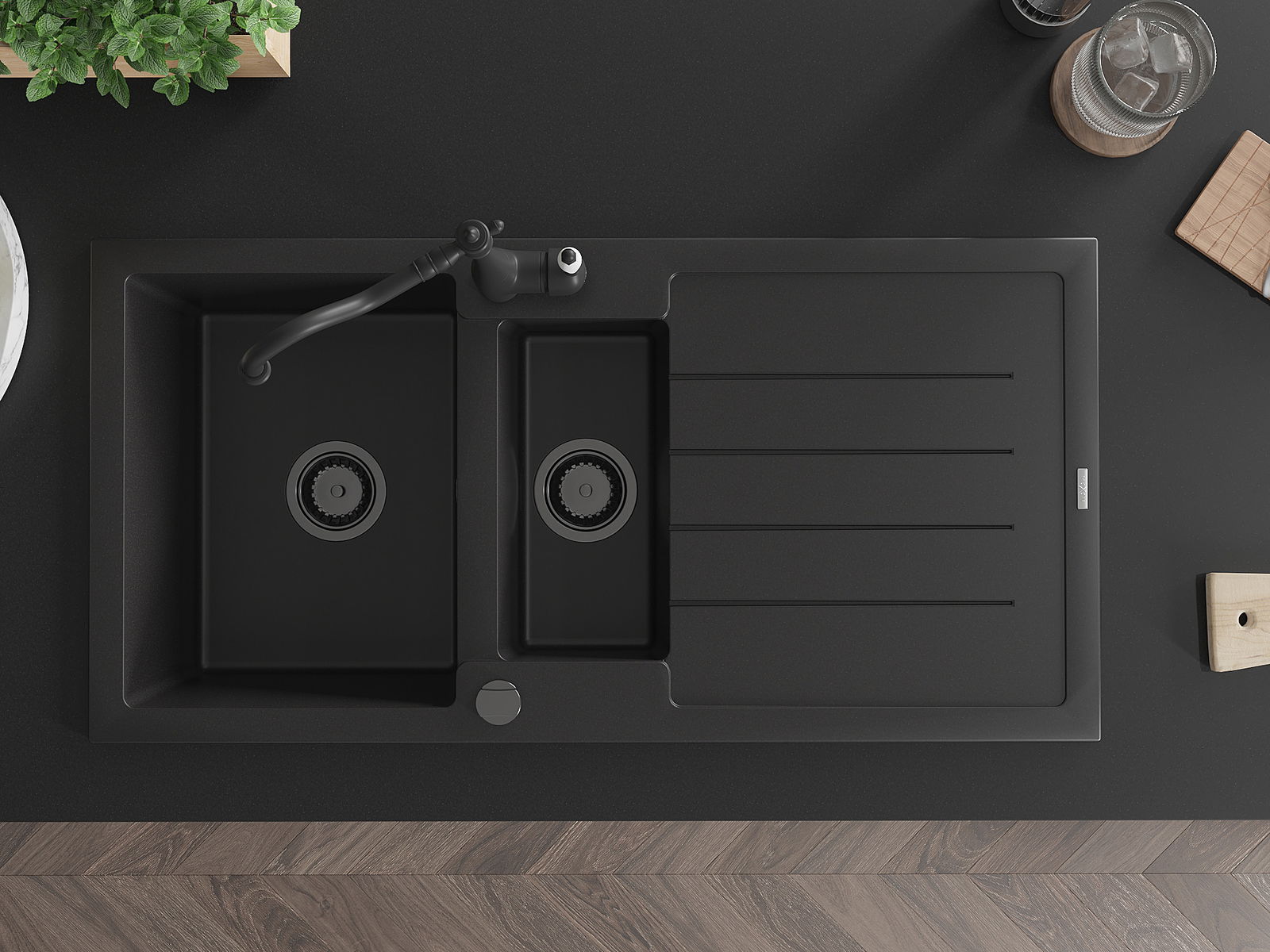 Mexen Andres chiuvetă de granit 1,5 compartimente cu scurgător și baterie de bucătărie Carla, negru - 6515-77-670700-70-B