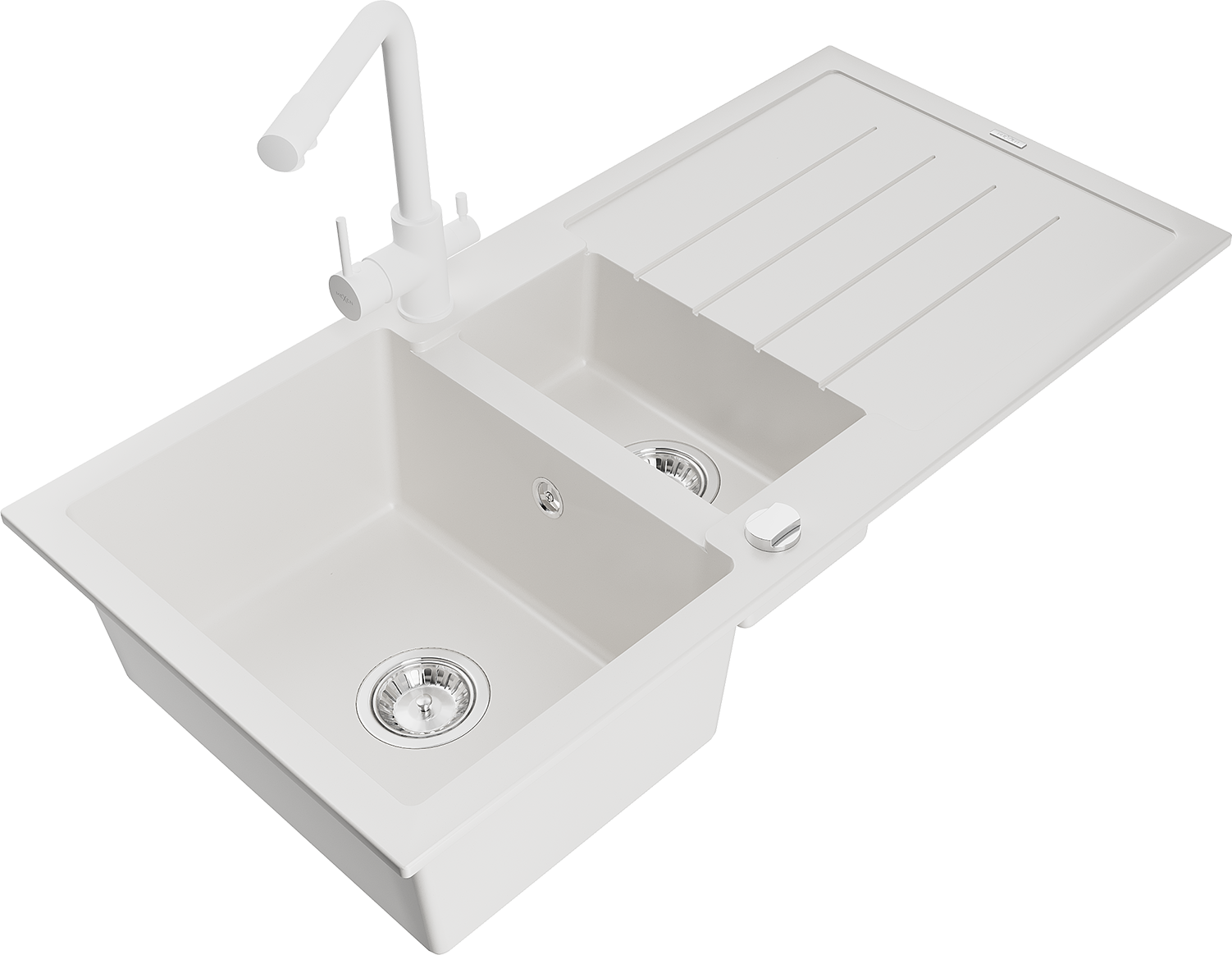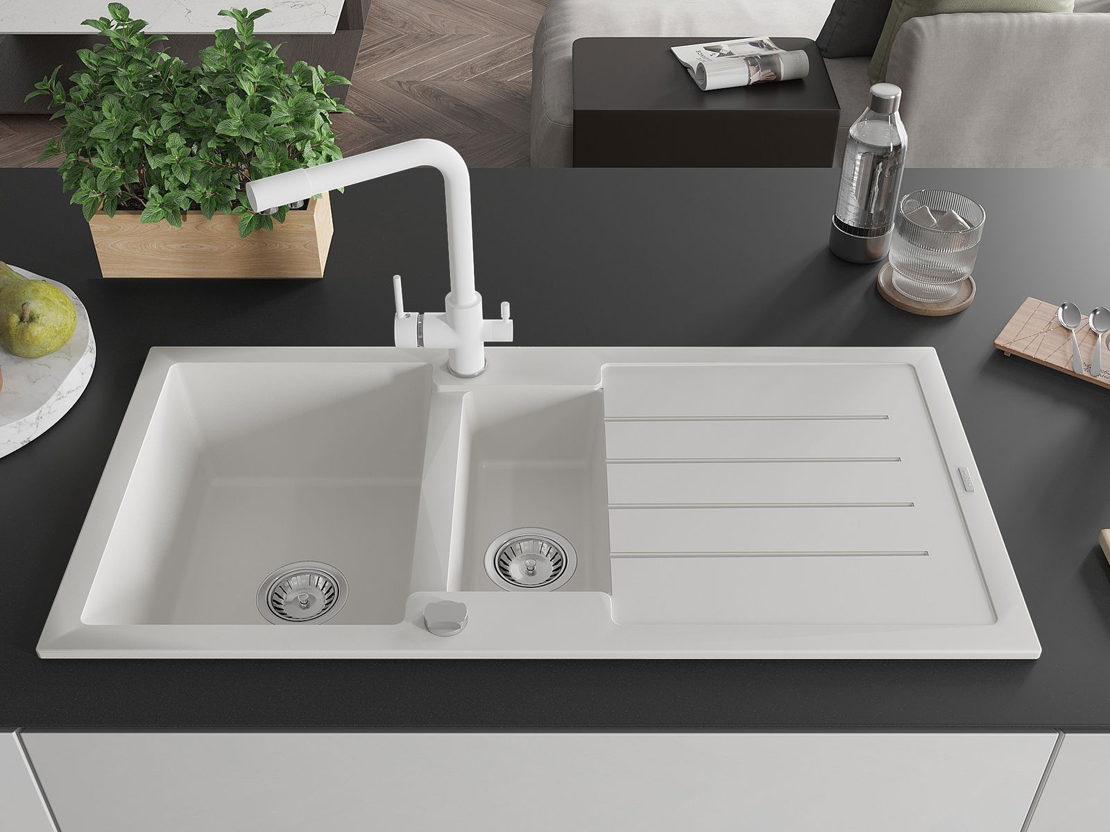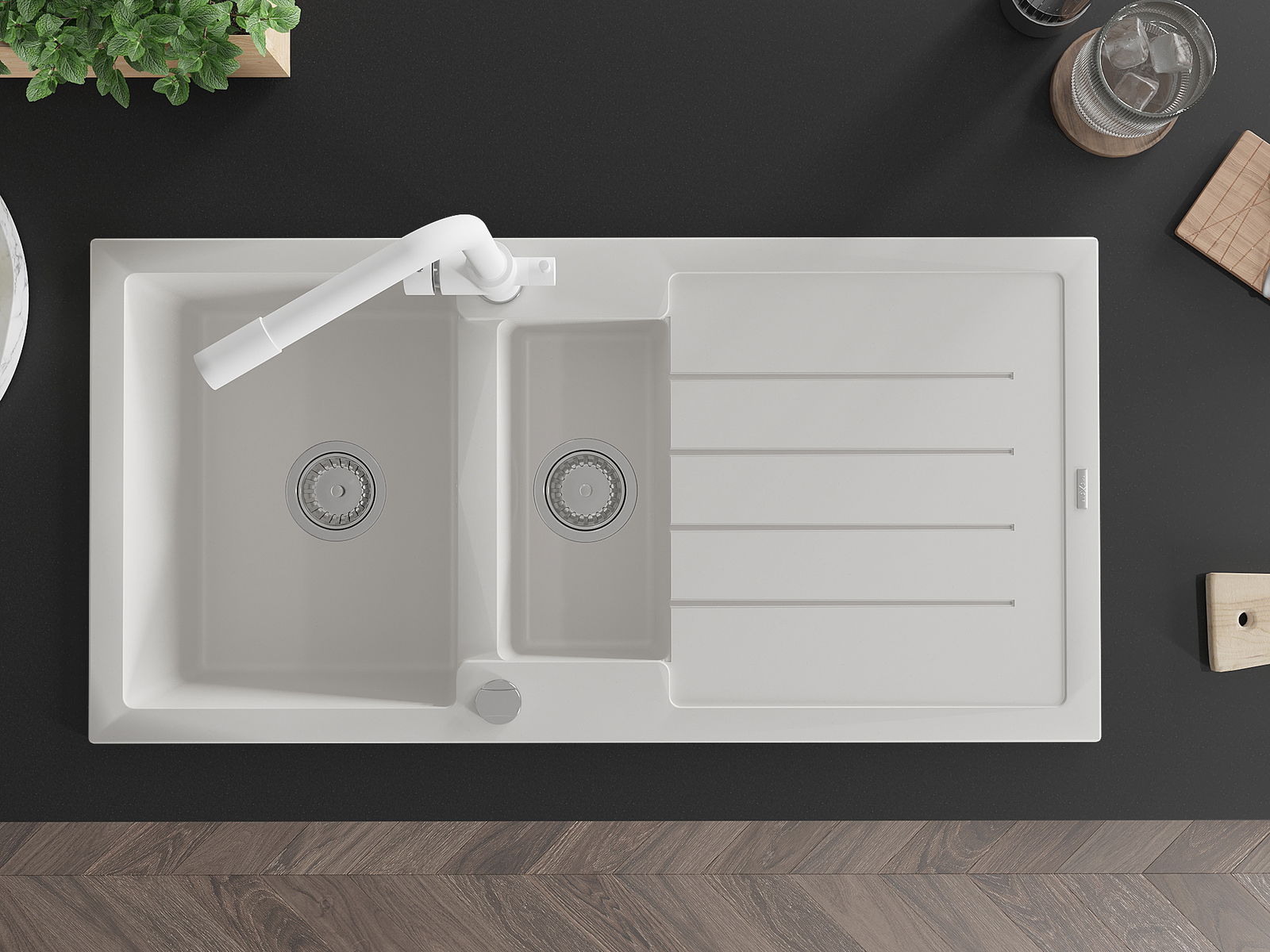 Mexen Andres chiuvetă de bucătărie din granit cu 1,5 cuve și scurgător și baterie de bucătărie Duero, alb - 6515-20-671600-20