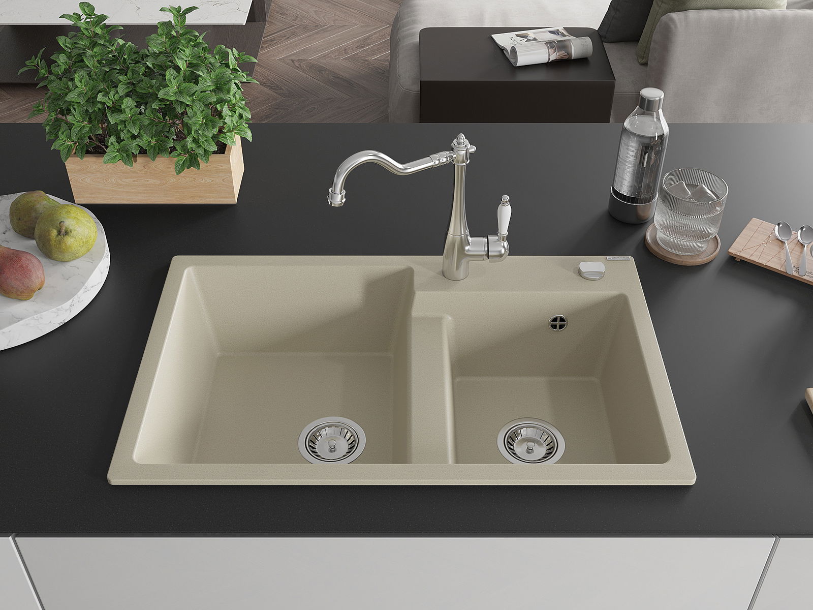 Mexen Tomas chiuvetă de bucătărie din granit, 2 compartimente, cu baterie Carla, bej - 6516-69-670700-00