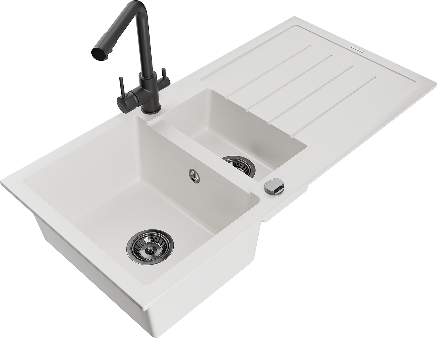 Mexen Andres chiuvetă de granit cu 1,5 compartimente, cu scurgător și baterie de bucătărie Duero, alb - 6515-20-671600-70