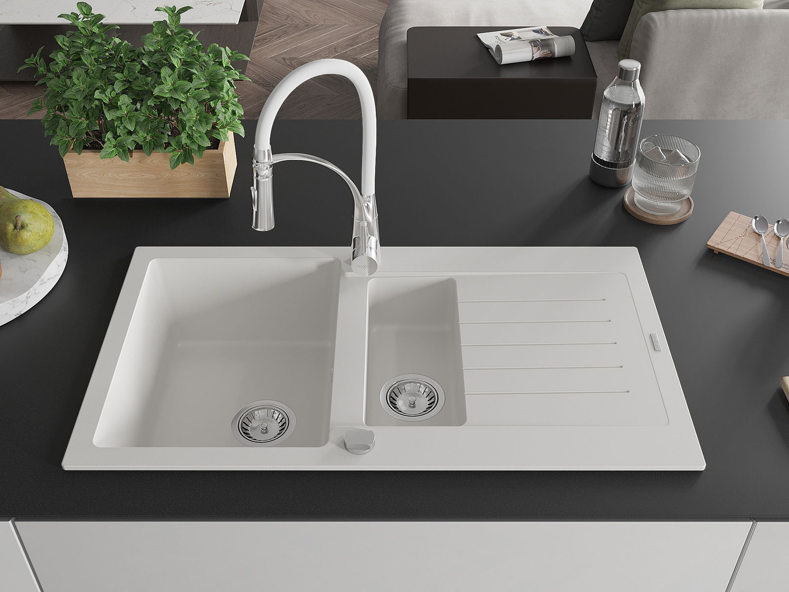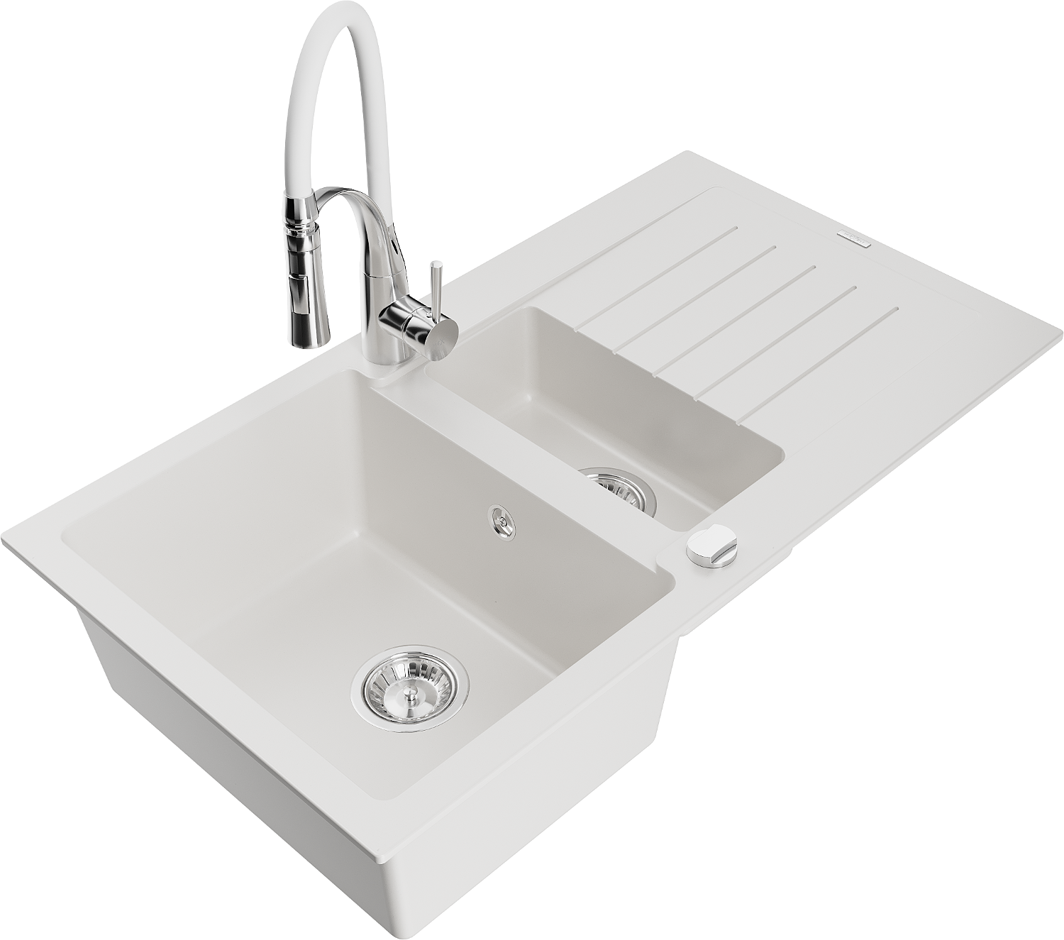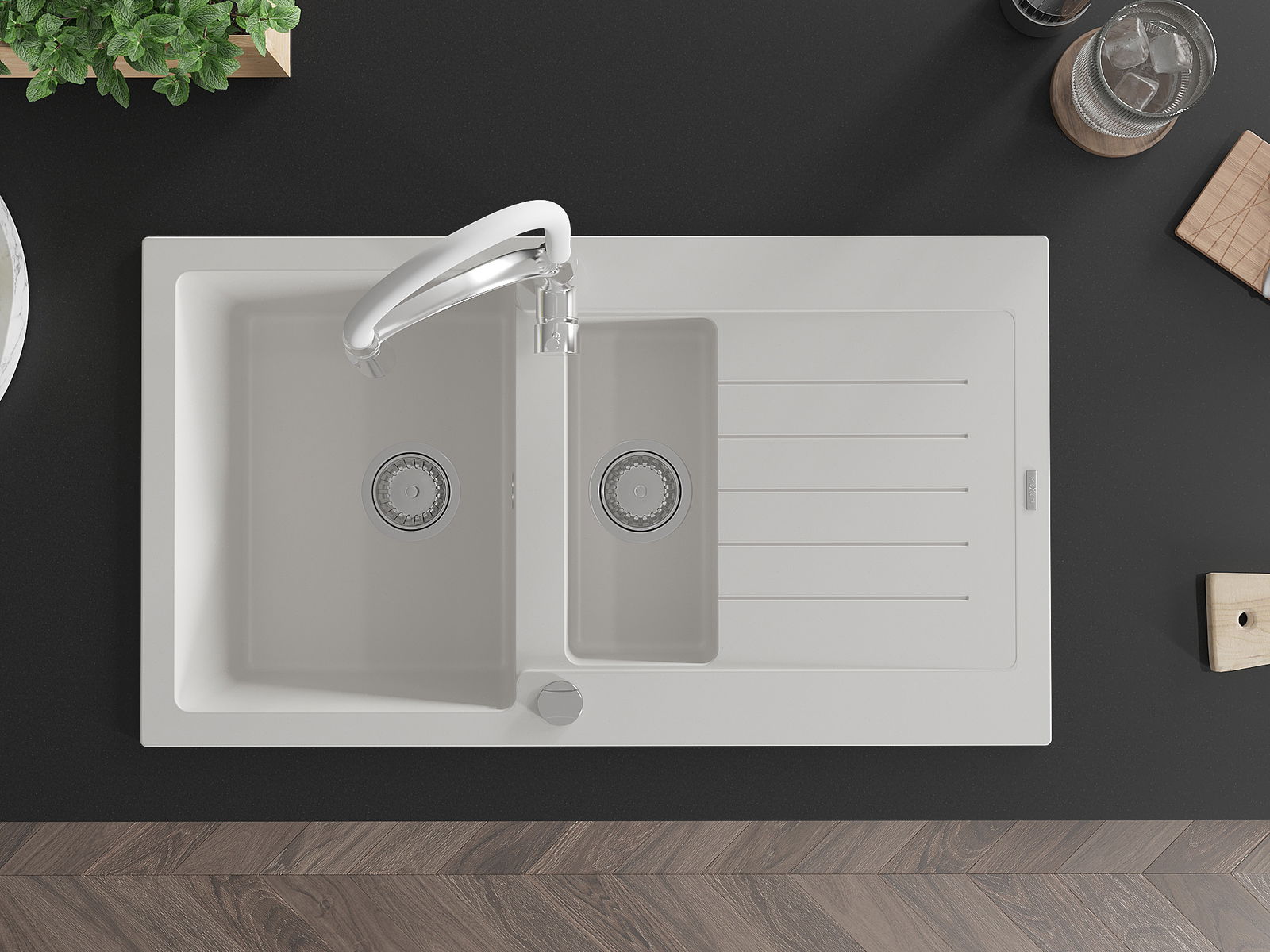 Mexen Matias chiuvetă de granit 1,5 compartimente cu picurător și baterie de bucătărie Aster, alb - 6502-20-73450-02