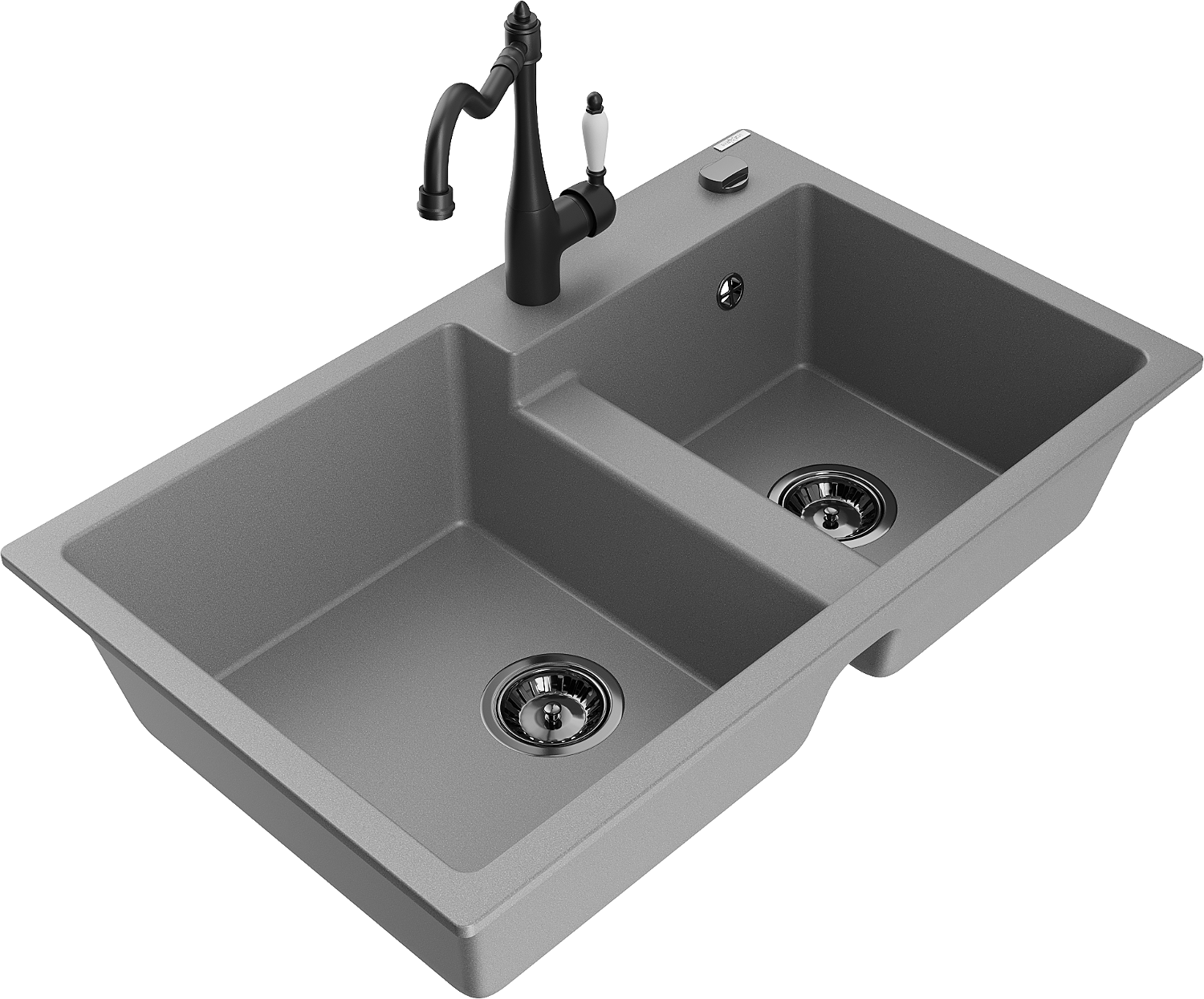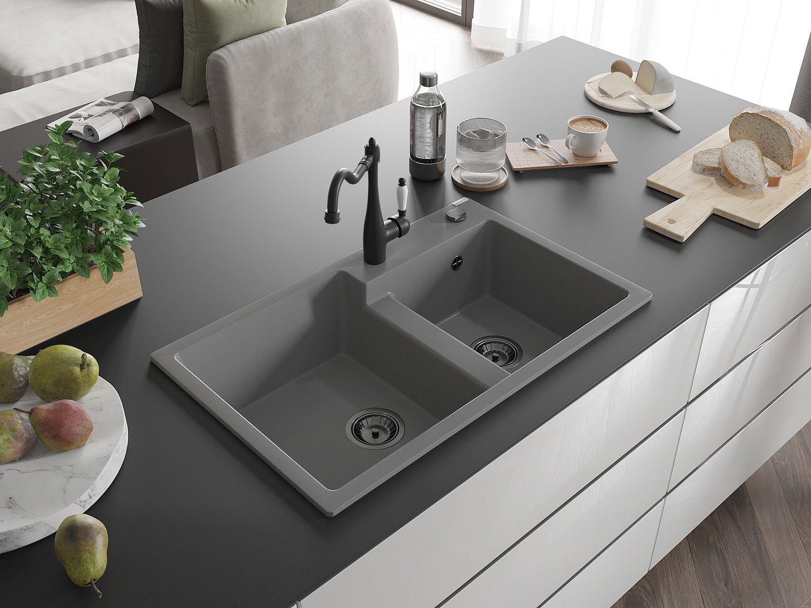 Mexen Tomas chiuvetă de bucătărie din granit cu 2 compartimente și baterie de bucătărie Carla, gri - 6516-71-670700-70-B