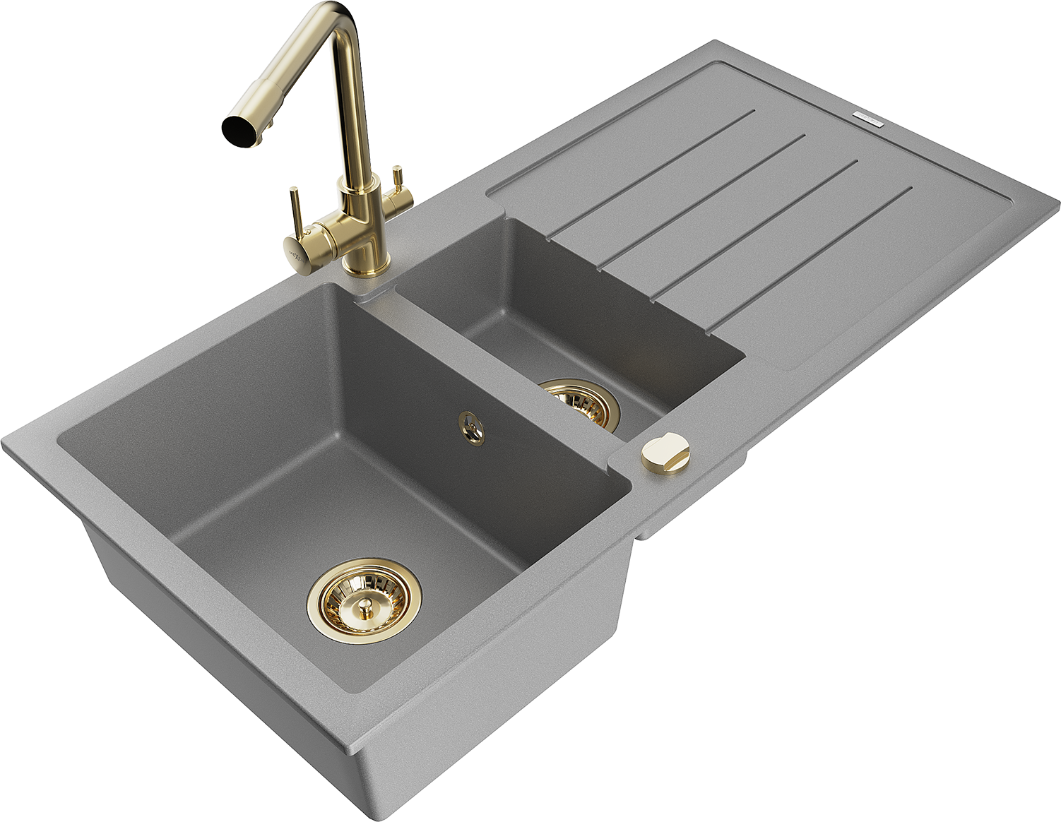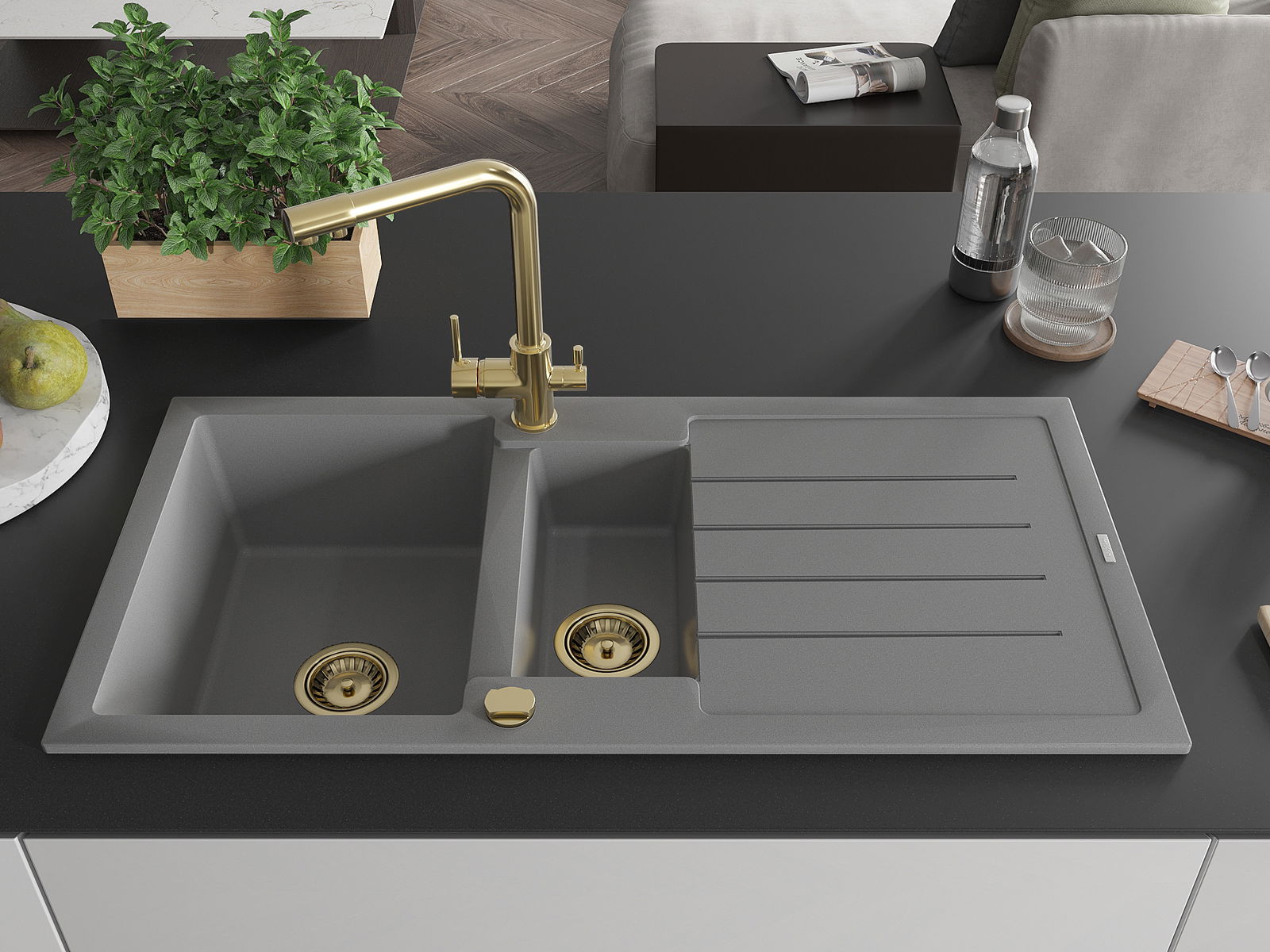 Mexen Andres chiuvetă de granit 1,5 compartiment cu picurătoare și baterie de bucătărie Duero, gri - 6515-71-671600-50