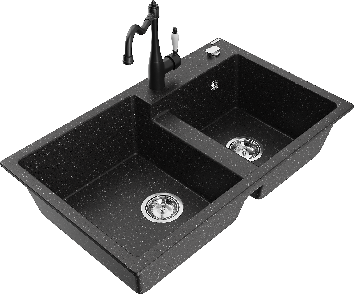 Mexen Tomas chiuvetă granit cu 2 compartimente și baterie de bucătărie Carla, negru/argintiu metalizat - 6516-73-670700-70