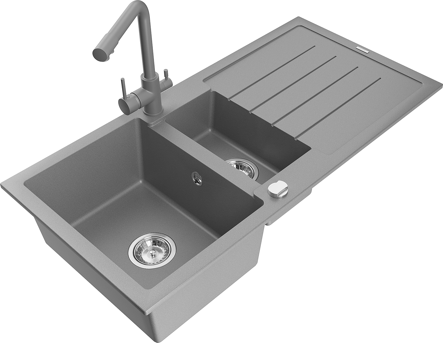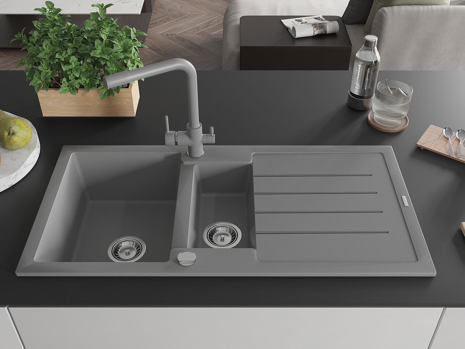Mexen Andres chiuvetă din granit cu 1,5 camere cu scurgător și baterie de bucătărie Duero, gri - 6515-71-671600-71