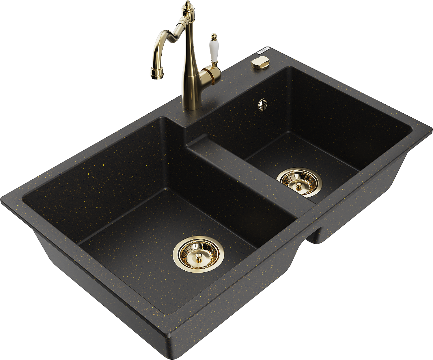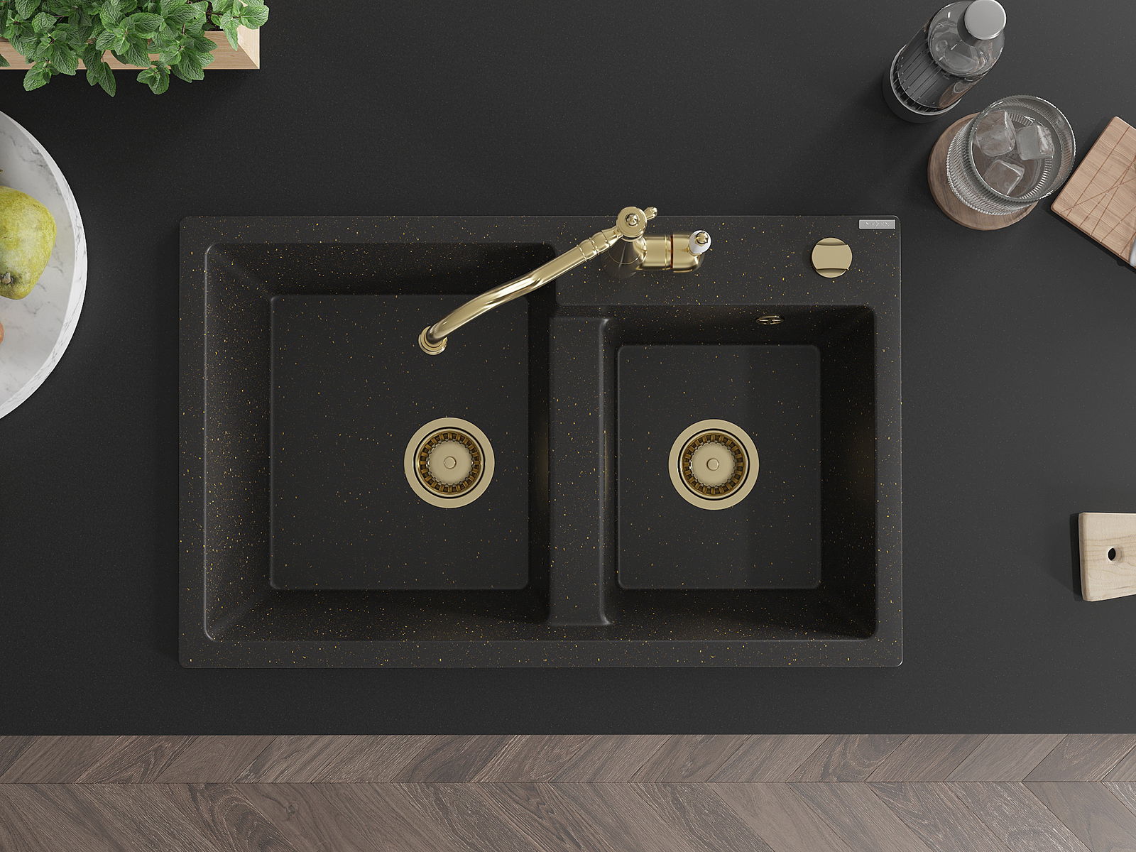 Mexen Tomas chiuvetă din granit cu 2 compartimente și baterie de bucătărie Carla, negru/auriu metalic - 6516-75-670700-50
