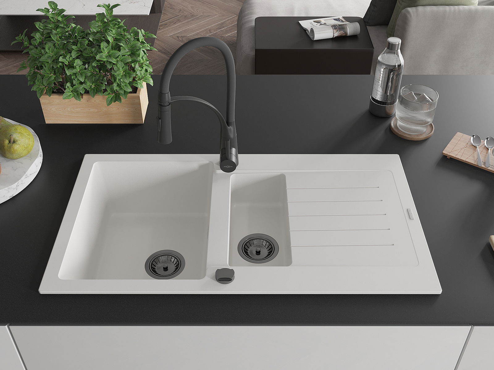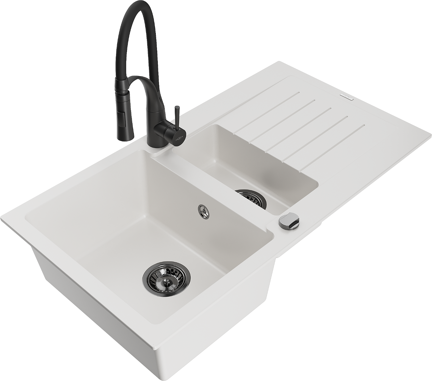 Mexen Matias chiuvetă de granit cu 1,5 cuve cu suport de scurgere și baterie de bucătărie Aster, albă - 6502-20-73450-70-B
