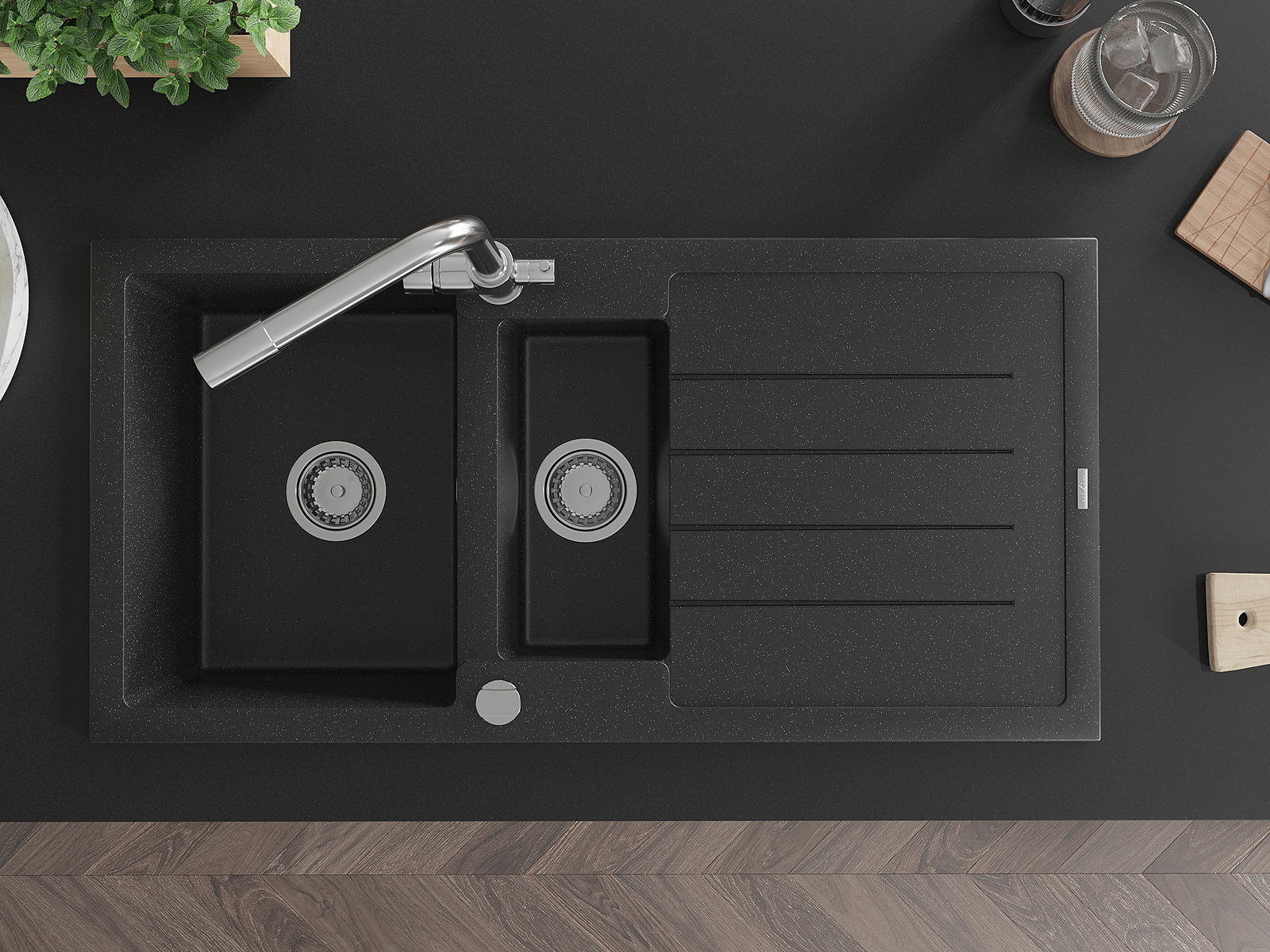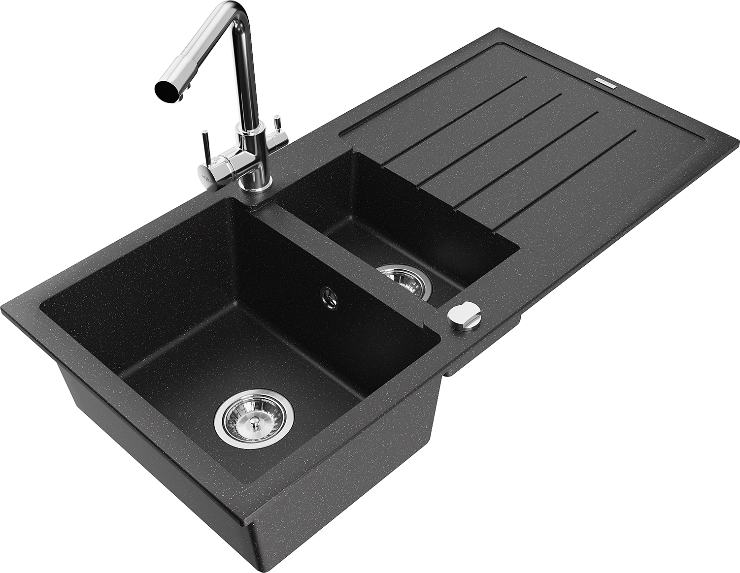 Mexen Andres chiuvetă de granit 1,5 compartimente cu scurgător și baterie de bucătărie Duero, negru/argintiu - 6515-73-671600-0?