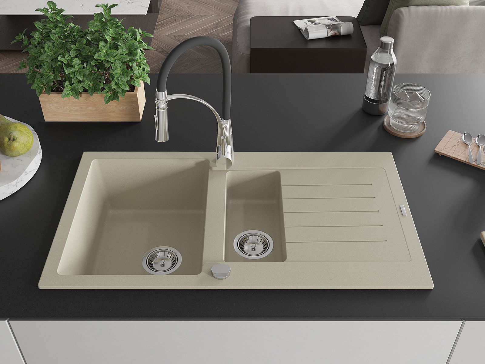 Mexen Matias chiuvetă de granit 1,5 compartimente cu scurgător și baterie de bucătărie Aster, bej - 6502-69-73450-07