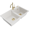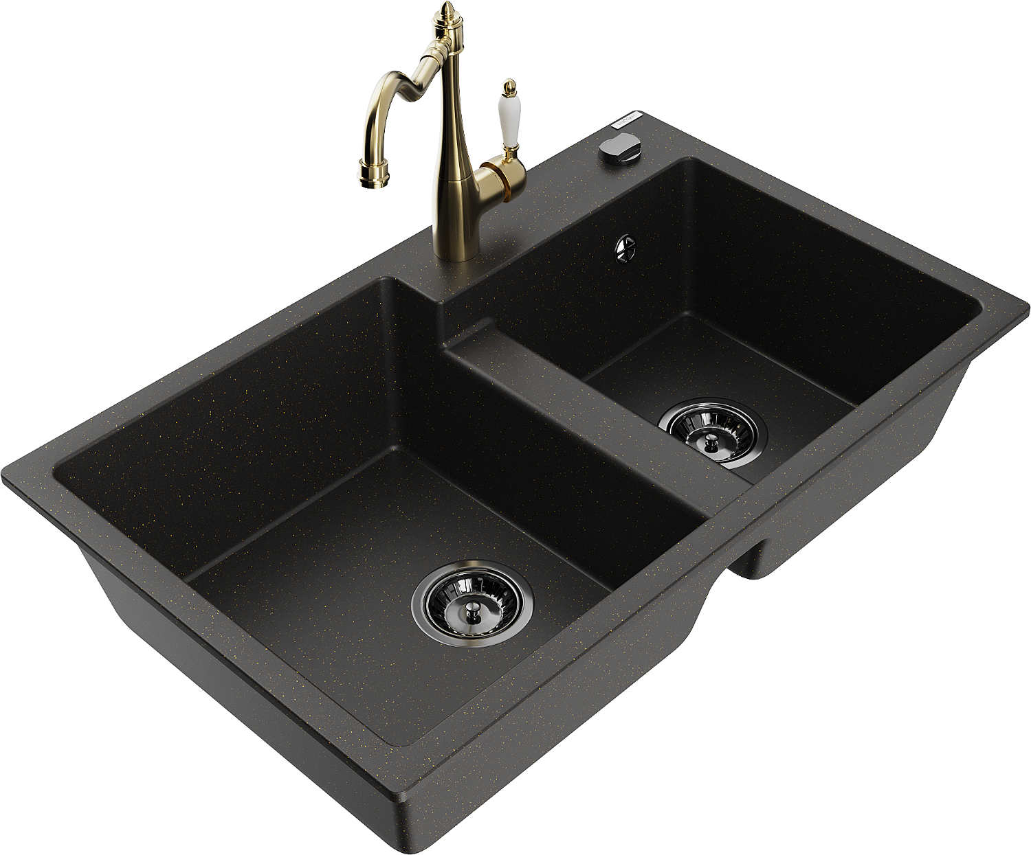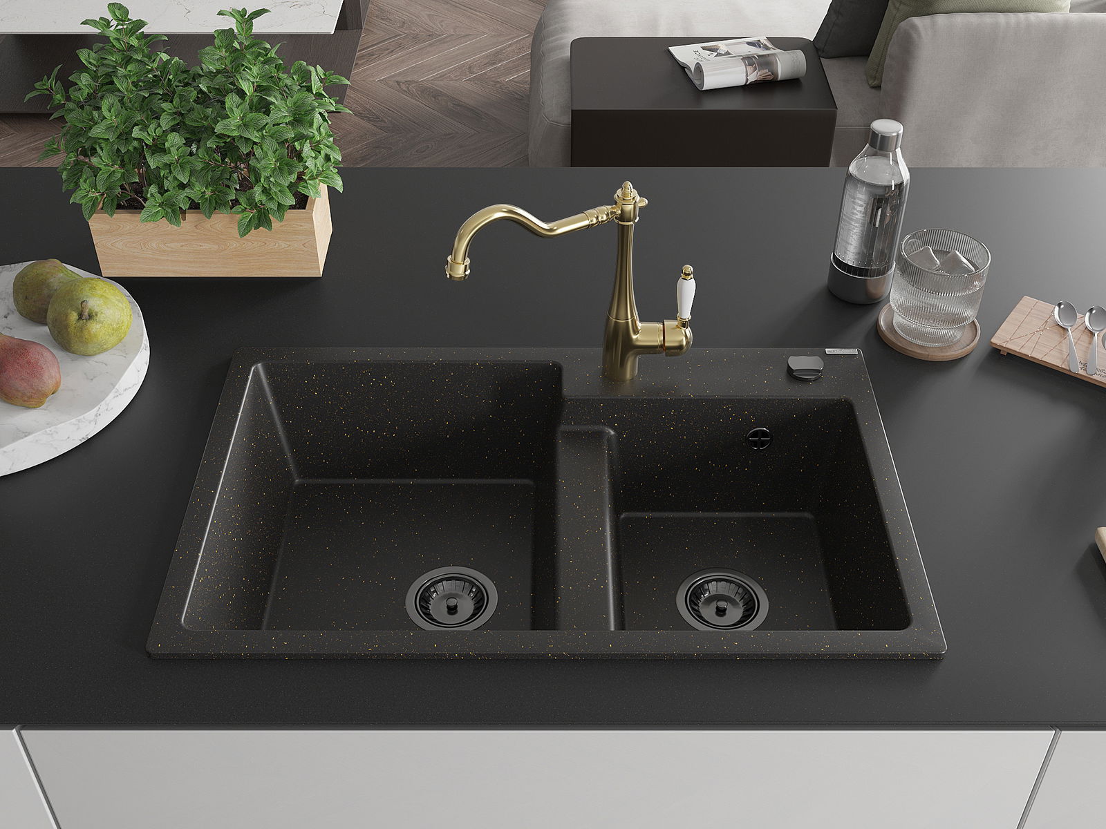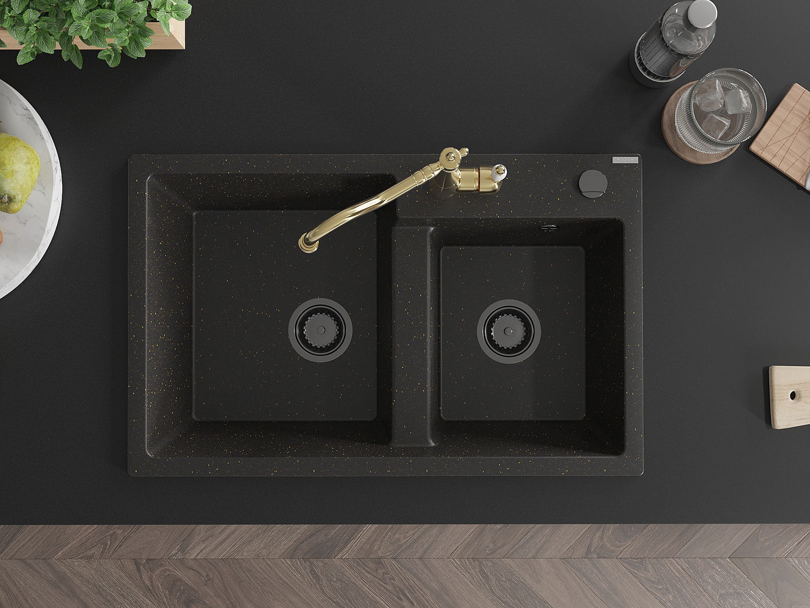 Mexen Tomas chiuvetă de granit cu 2 compartimente și baterie de bucătărie Carla, negru/metalizat auriu - 6516-75-670700-50-B