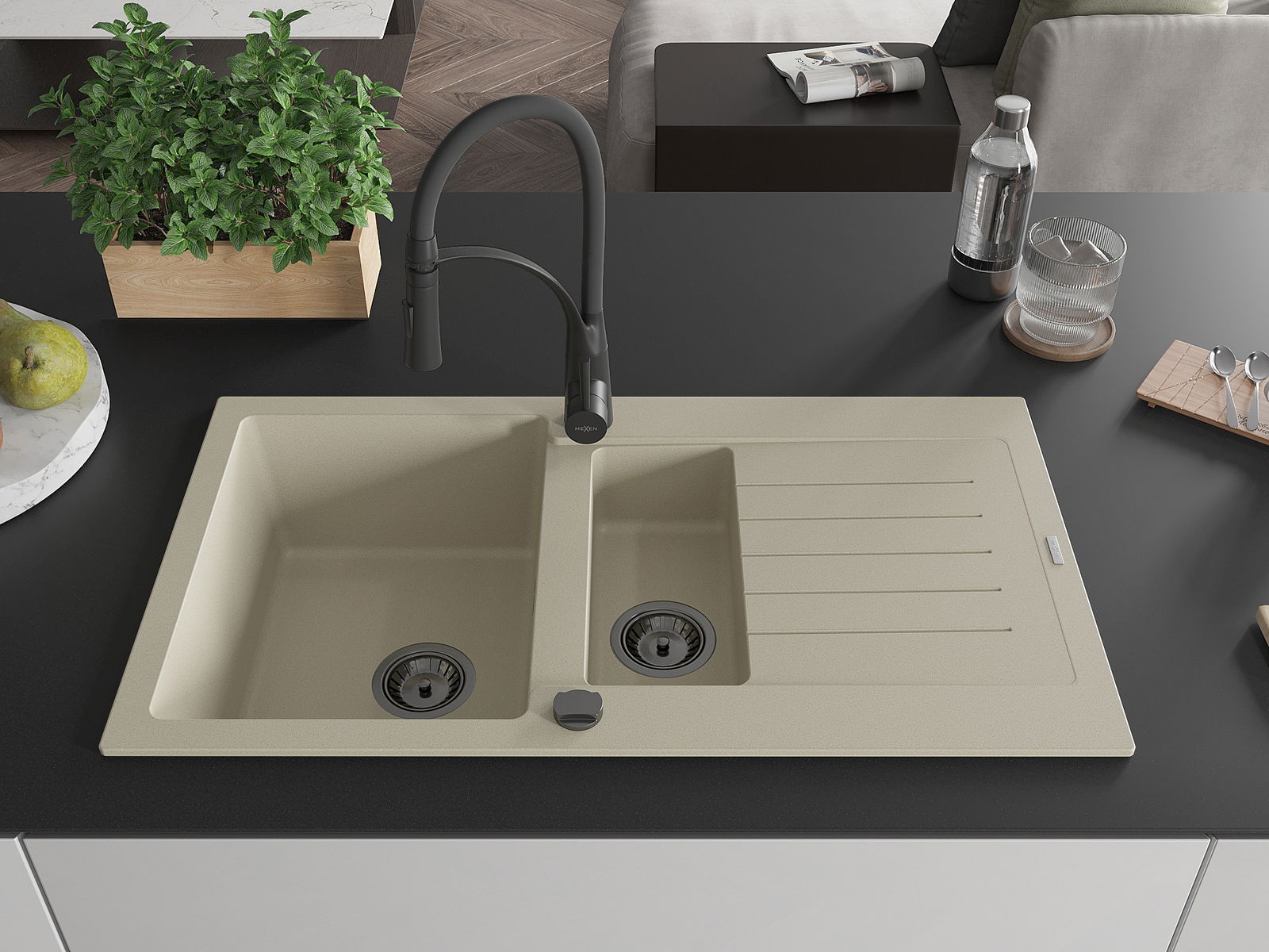 Mexen Matias chiuvetă din granit 1,5 camere cu scurgător și baterie de bucătărie Aster, bej - 6502-69-73450-70-B