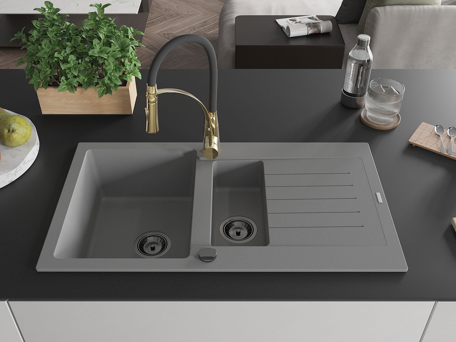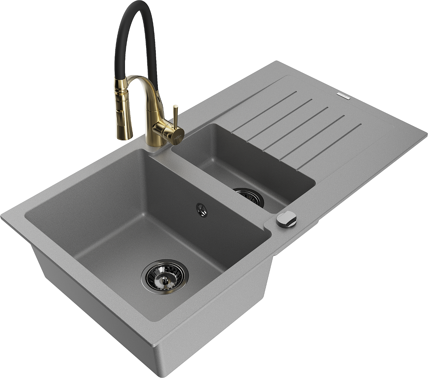 Mexen Matias chiuvetă din granit cu 1,5 compartimente cu picurător și baterie de bucătărie Aster, gri - 6502-71-73450-57-B