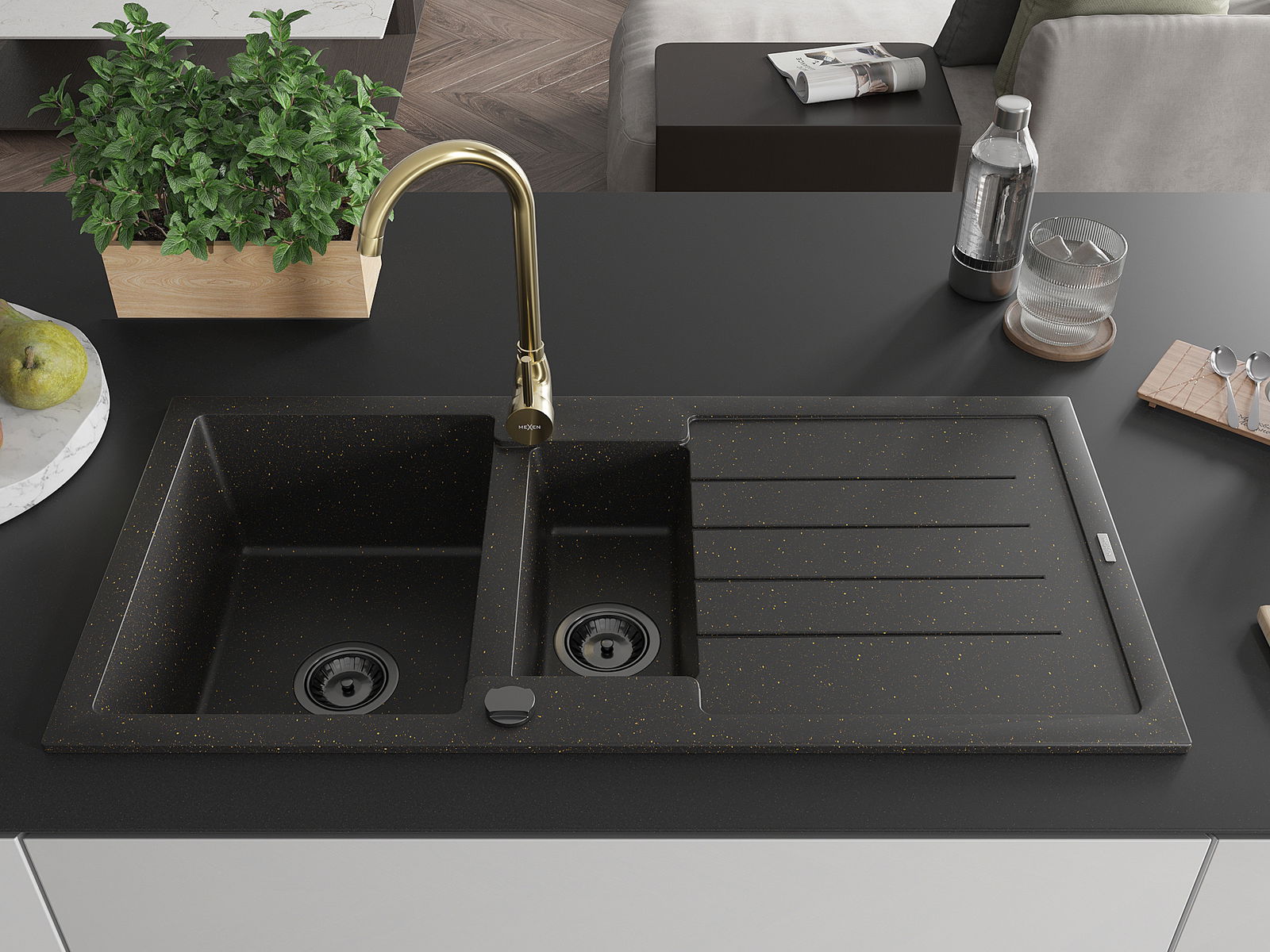 Mexen Andres chiuvetă de granit cu 1,5 compartimente cu scurgător și baterie de bucătărie Telma, negru/auriu - 6515-75-670200-5?