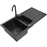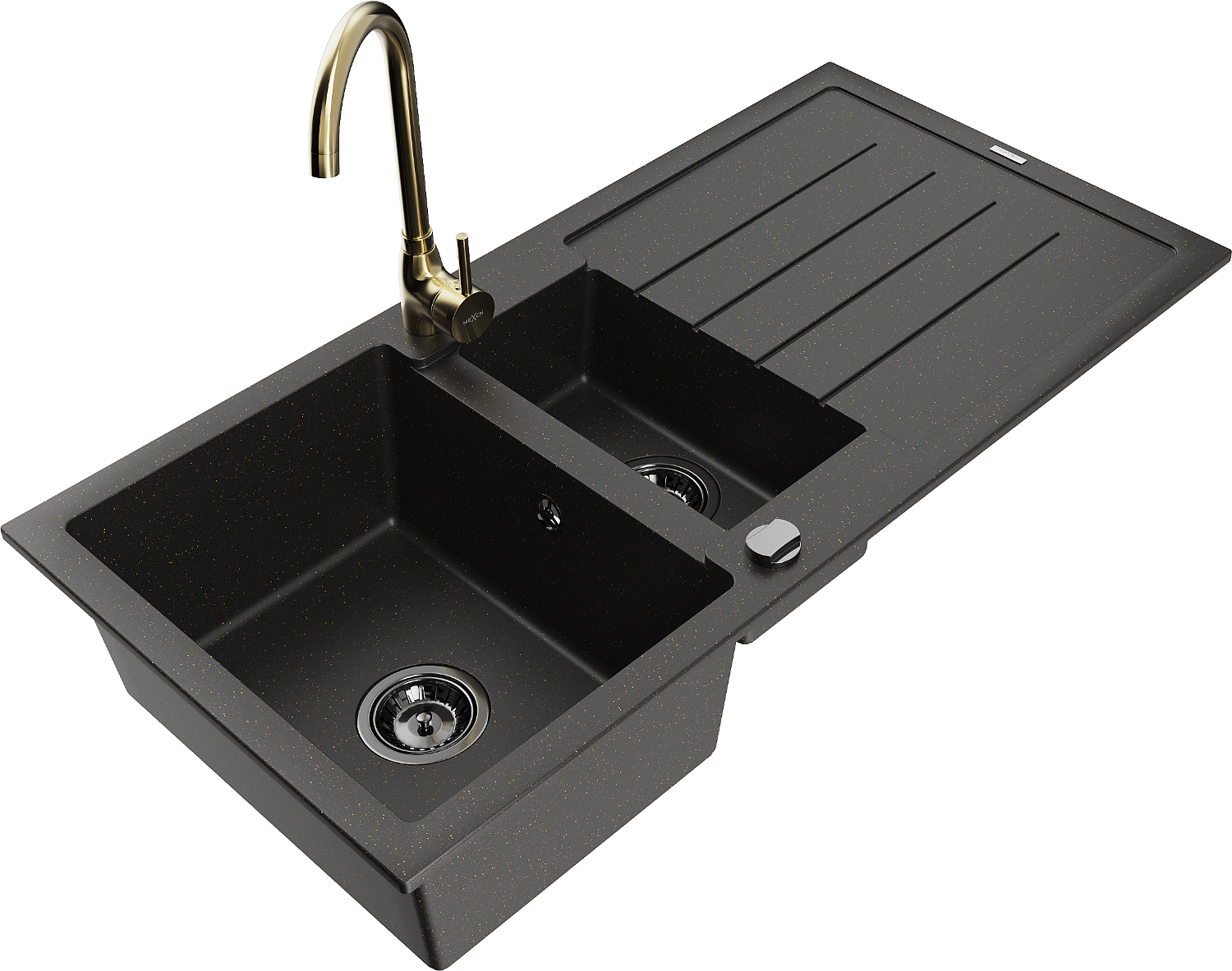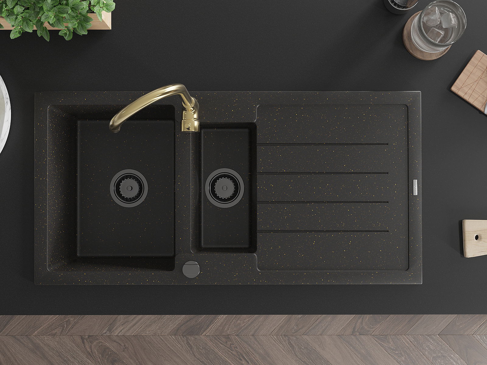 Mexen Andres chiuvetă de granit cu 1,5 cuve, cu picurător și baterie de bucătărie Telma, negru/auriu - 6515-75-670200-50-B