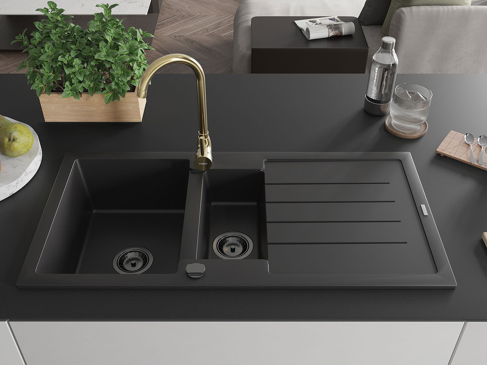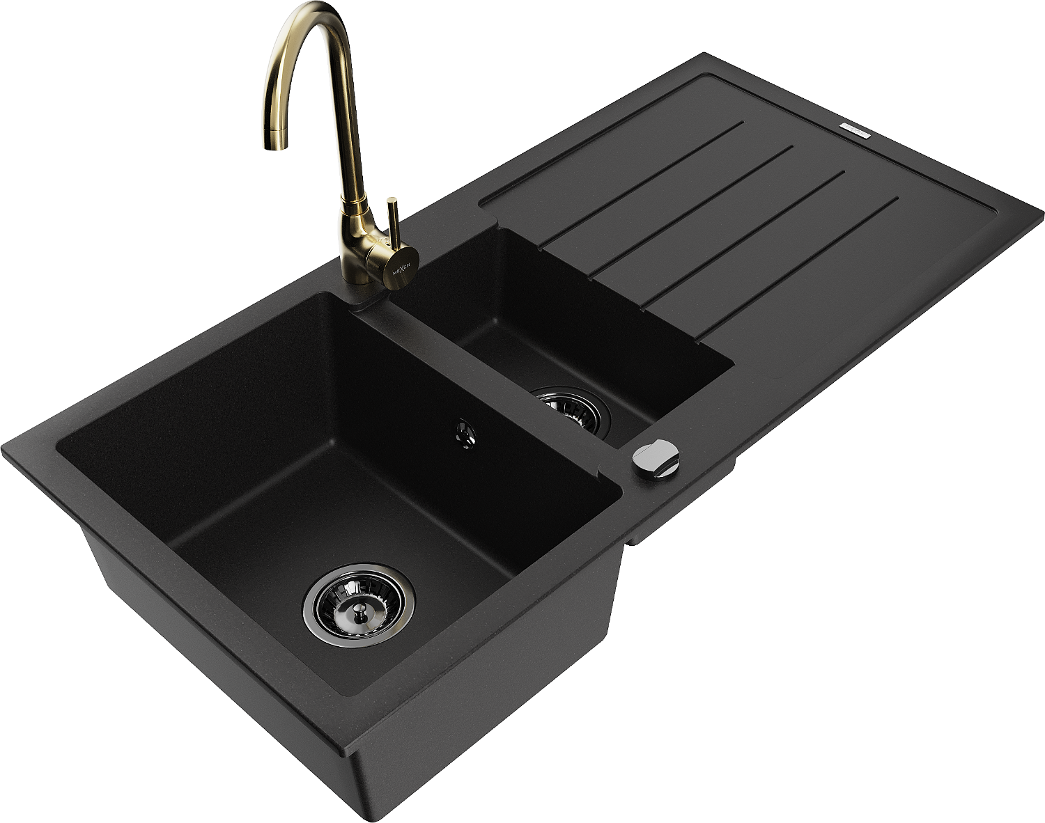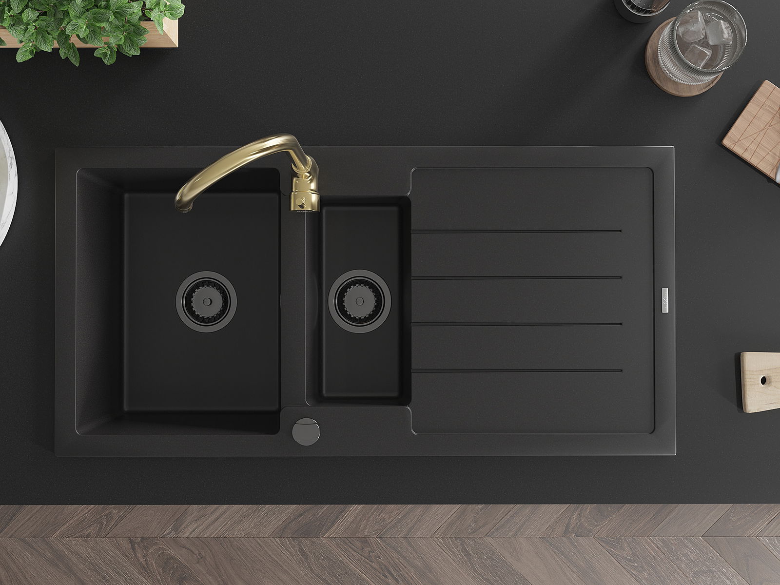 Mexen Andres chiuvetă din granit cu 1,5 camere, cu scurgător și baterie de bucătărie Telma, negru - 6515-77-670200-50-B