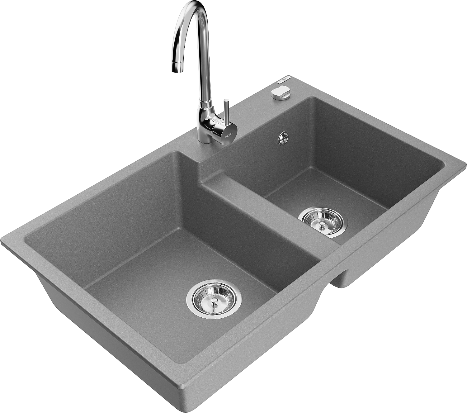 Mexen Tomas chiuvetă de bucătărie din granit cu 2 compartimente și robinet de bucătărie Telma, gri - 6516-71-670200-00