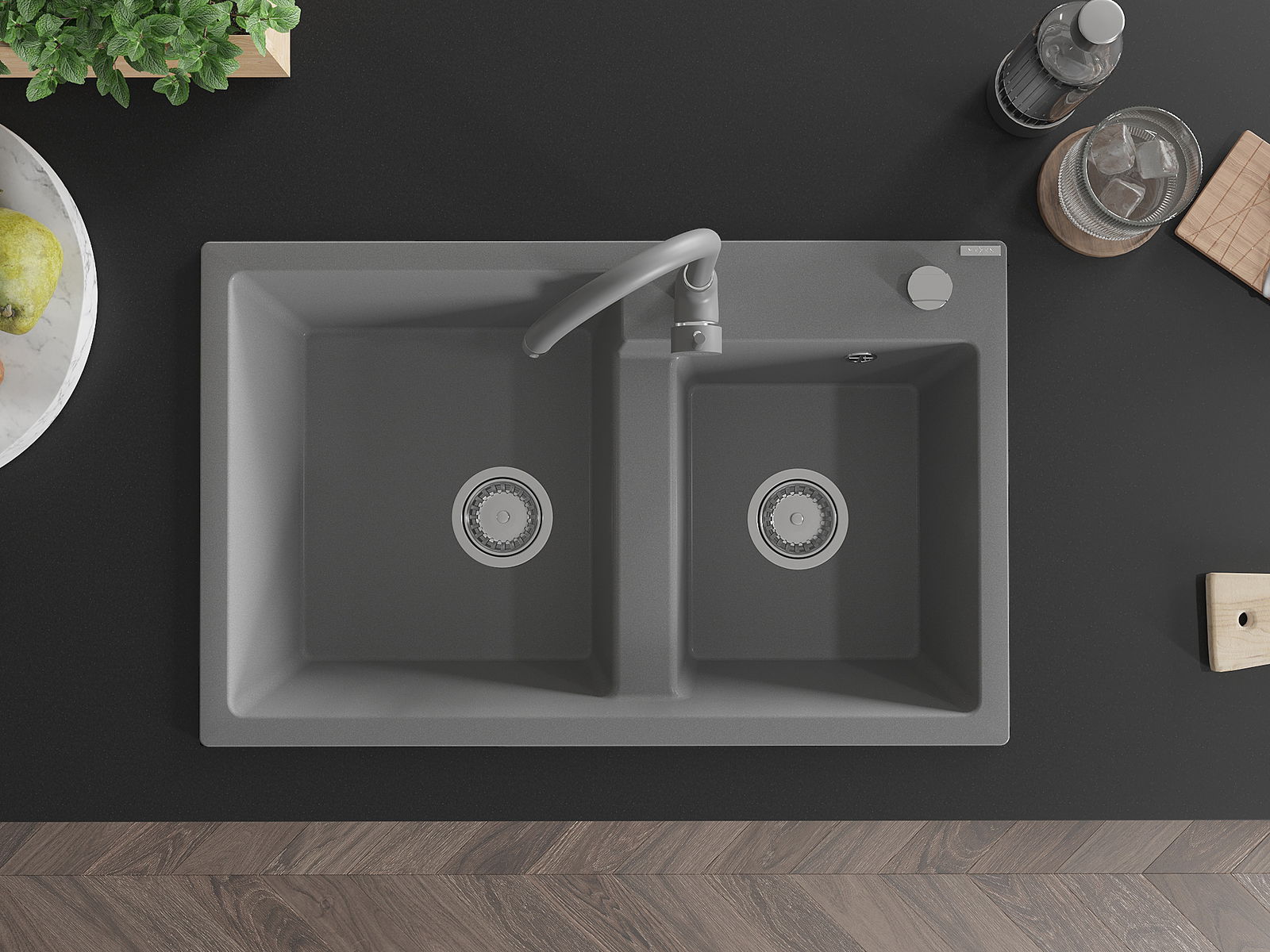 Mexen Tomas chiuvetă de bucătărie din granit cu 2 compartimente cu baterie Telma, gri - 6516-71-670200-71