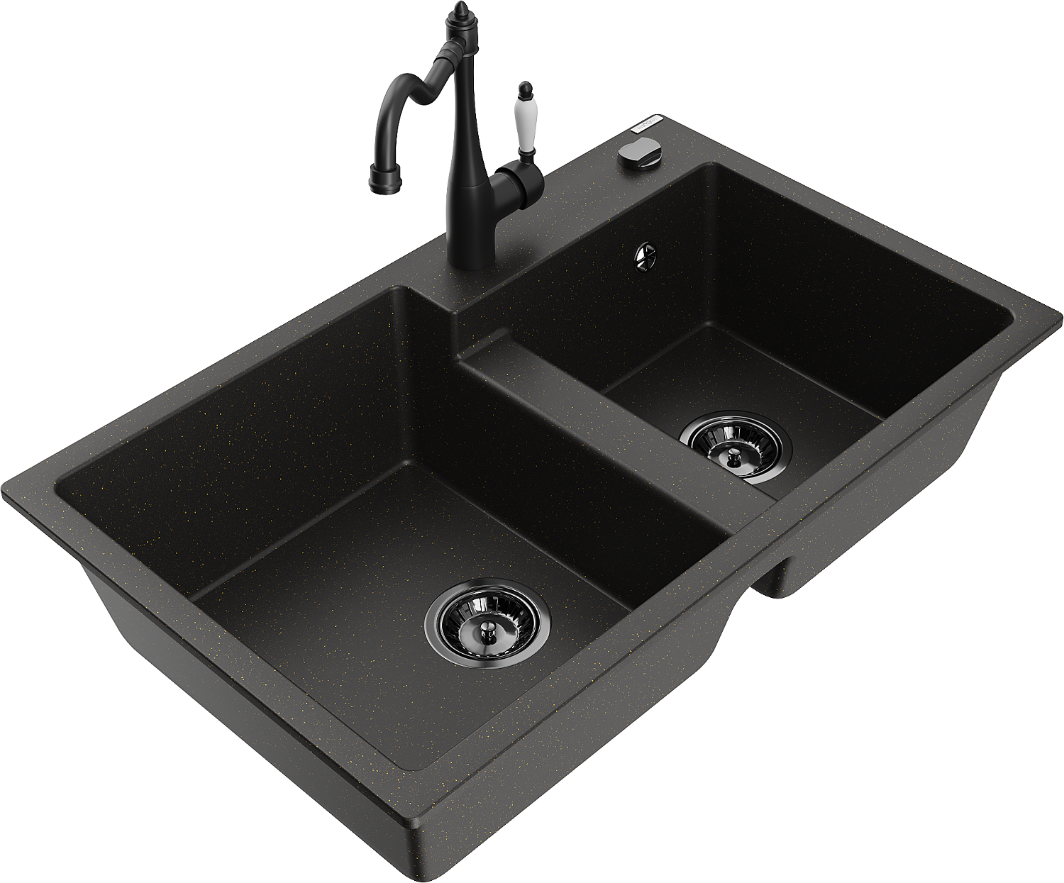 Mexen Tomas chiuvetă de granit cu 2 compartimente cu baterie de bucătărie Carla, negru/auriu metalic - 6516-75-670700-70-B