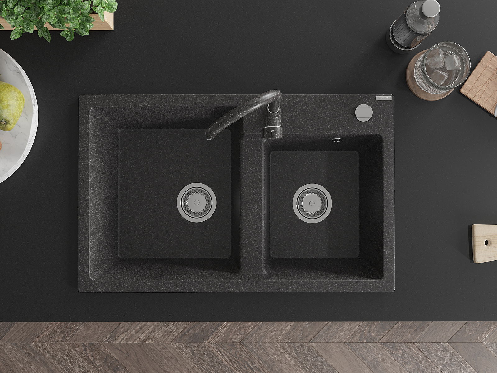 Mexen Tomas chiuvetă de bucătărie din granit cu 2 compartimente și baterie Telma, negru cu stropi - 6516-76-670200-76