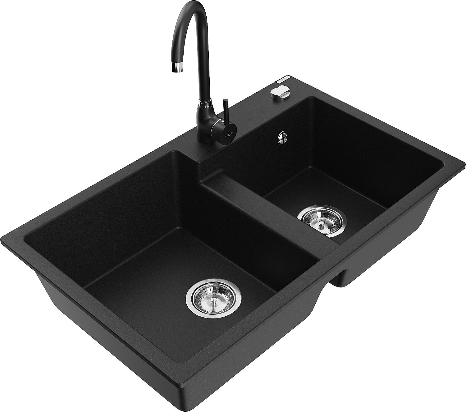 Mexen Tomas chiuvetă de granit cu 2 compartimente și baterie de bucătărie Telma, negru - 6516-77-670200-70