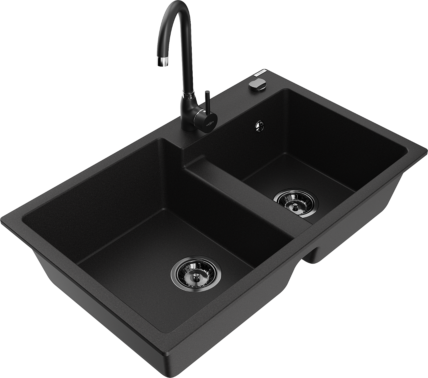 Mexen Tomas chiuvetă de bucătărie din granit cu 2 compartimente și baterie Telma, neagră - 6516-77-670200-70-B