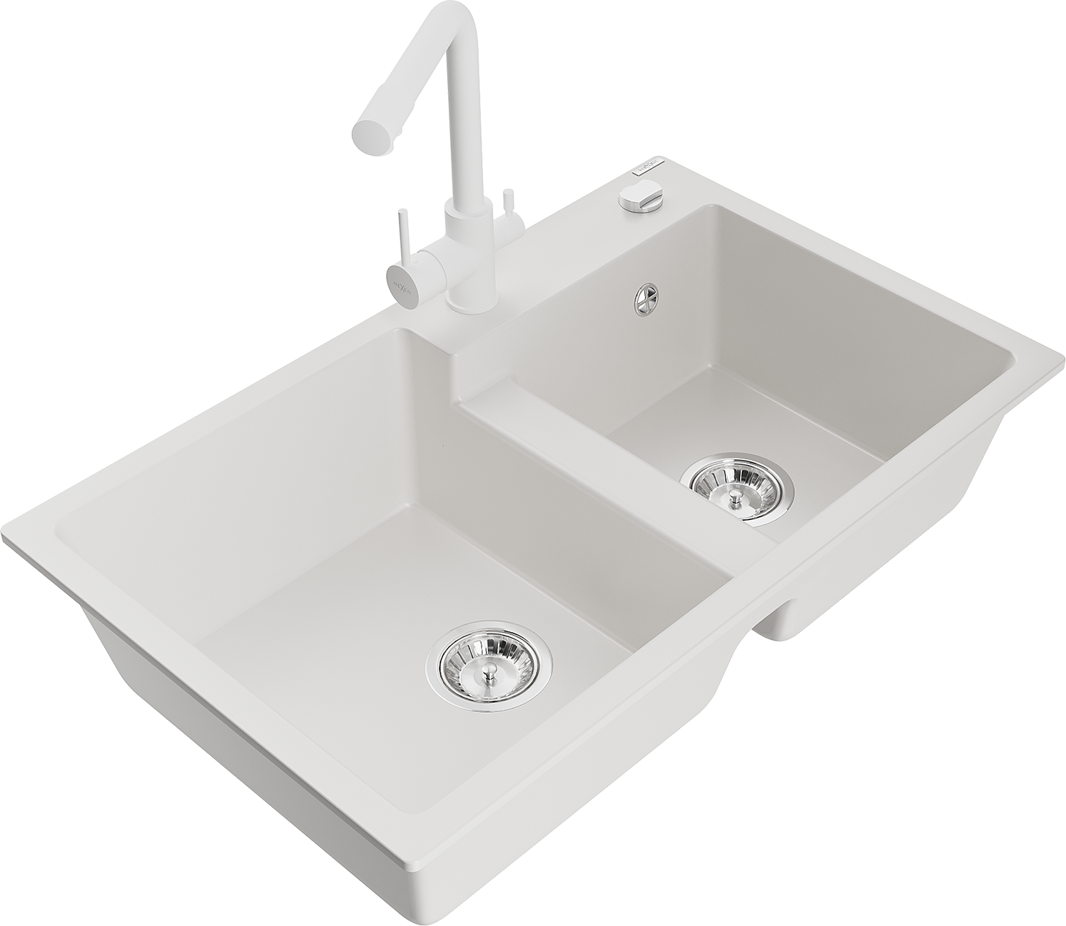 Mexen Tomas chiuvetă de bucătărie din granit cu 2 compartimente și baterie de bucătărie Duero, alb - 6516-20-671600-20