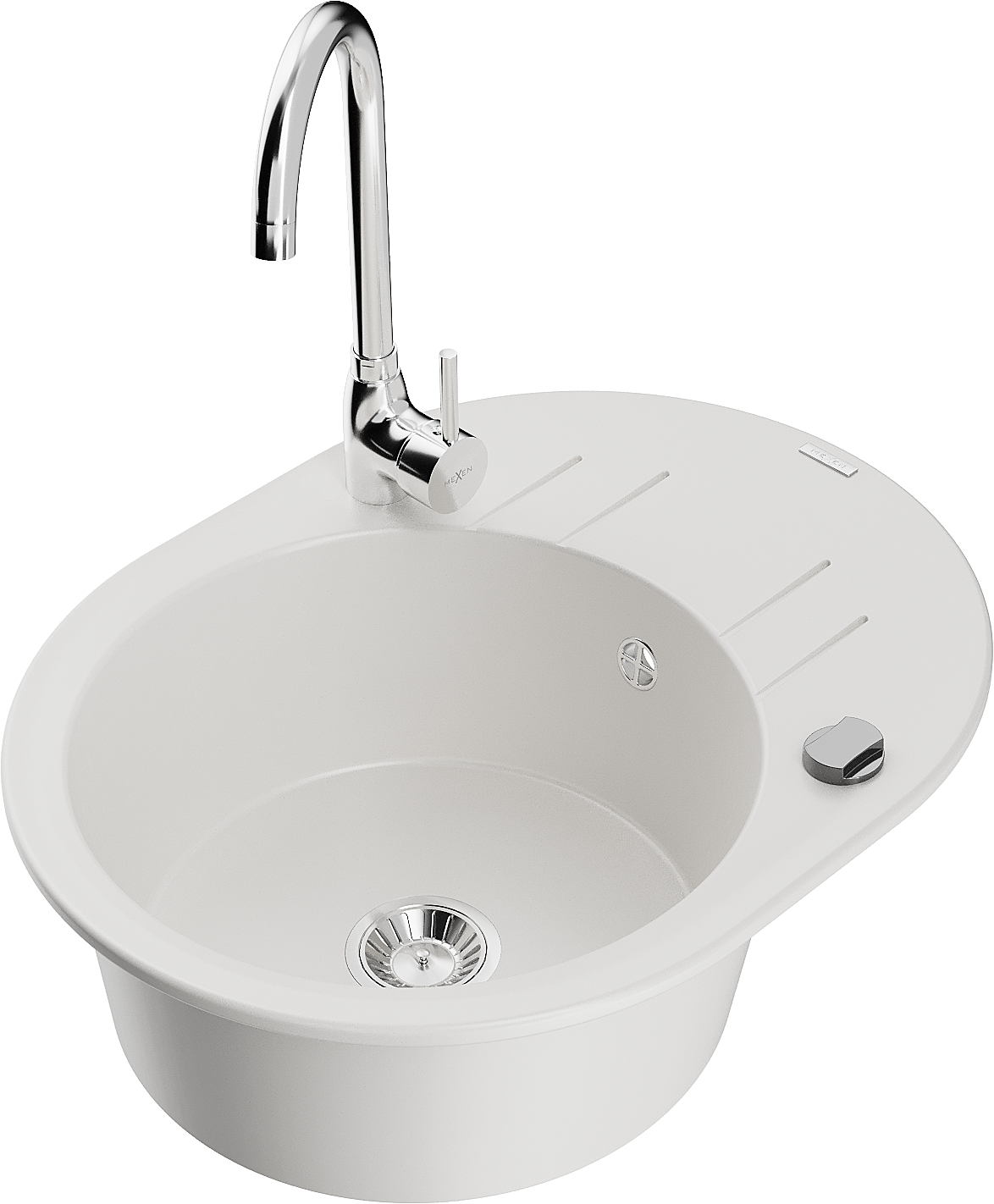 Mexen Kevin chiuvetă de bucătărie din granit cu 1 cuvă și scurgător și baterie Telma, alb - 6517-20-670200-00