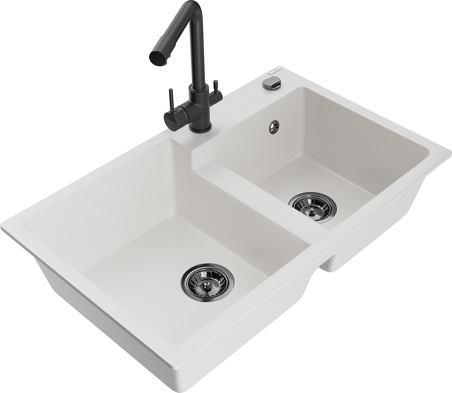 Mexen Tomas chiuvetă de bucătărie din granit cu 2 compartimente și baterie de bucătărie Duero, alb - 6516-20-671600-70