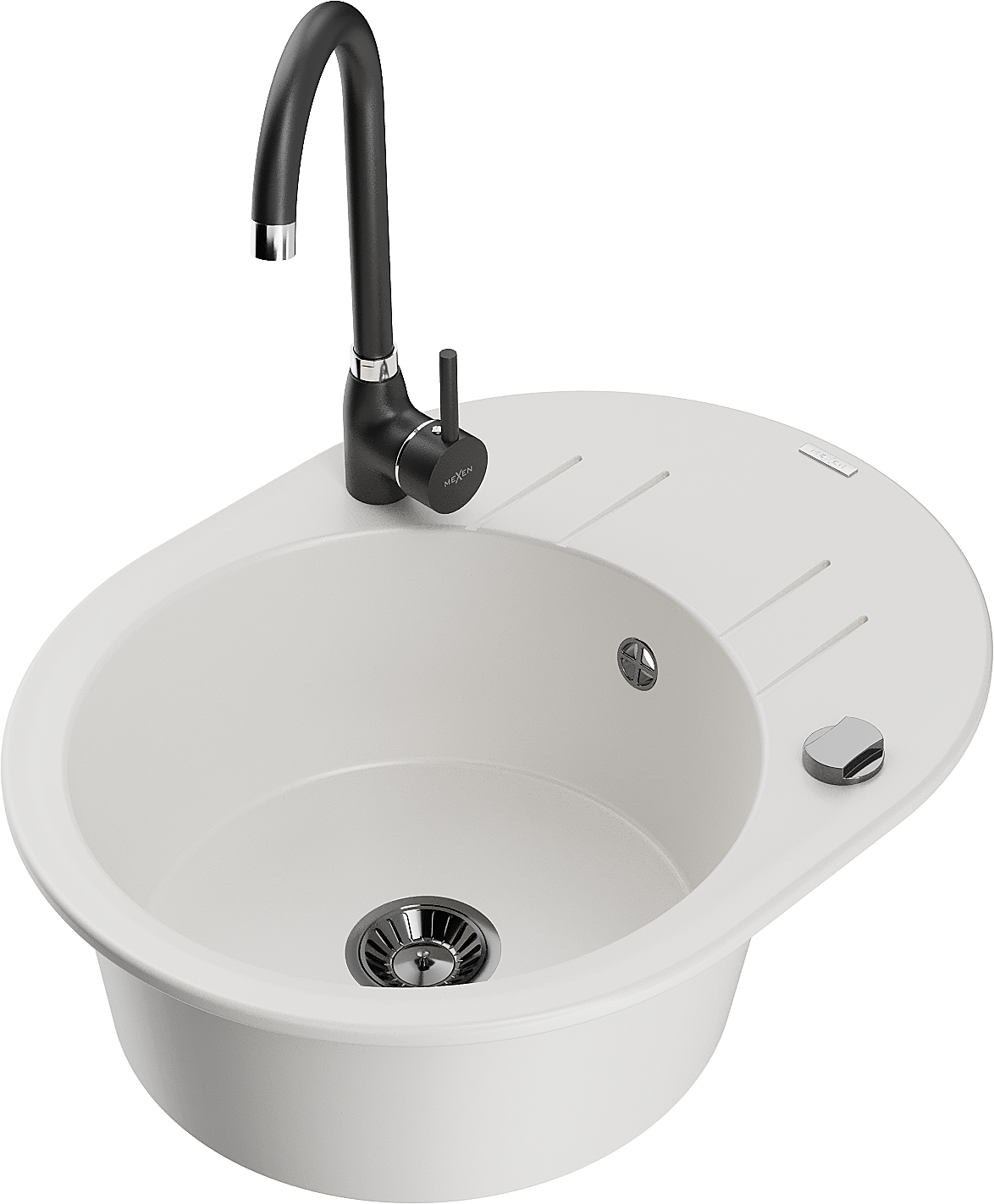 Mexen Kevin chiuvetă de granit cu 1 compartiment cu picurător și baterie de bucătărie Telma, alb - 6517-20-670200-70